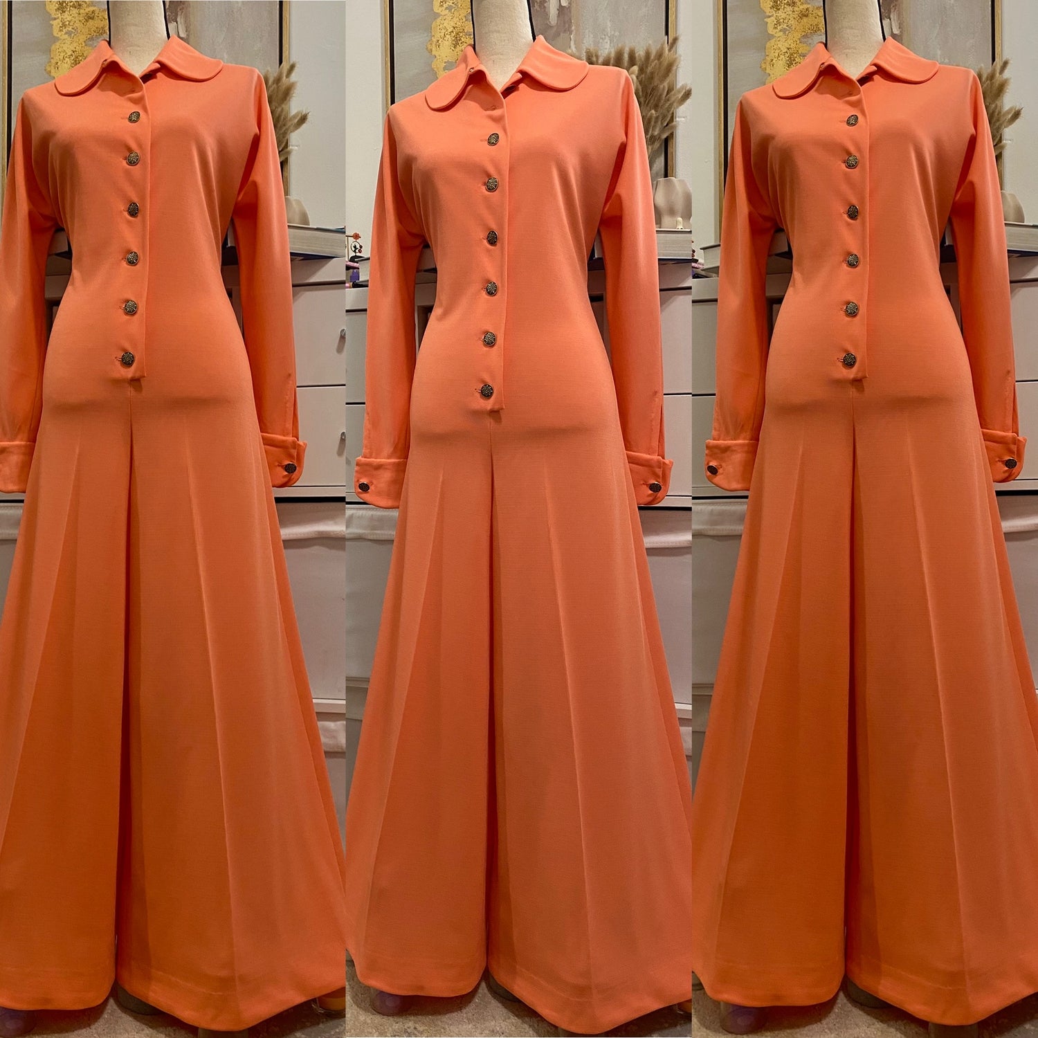 Fabulous 1970's disco bell bottom jumpsuit chic at its best. It features a front button down style, long sleeves with button cuffs, and mega wide, 36" diameter bell bottoms that flare out at the knee. Soft and scrumptious color that would best described as a creamsicle orange. A very alluring jumpsuit that is versatile wherever you wear it; ideal for lounging as well as for a fun, night out.