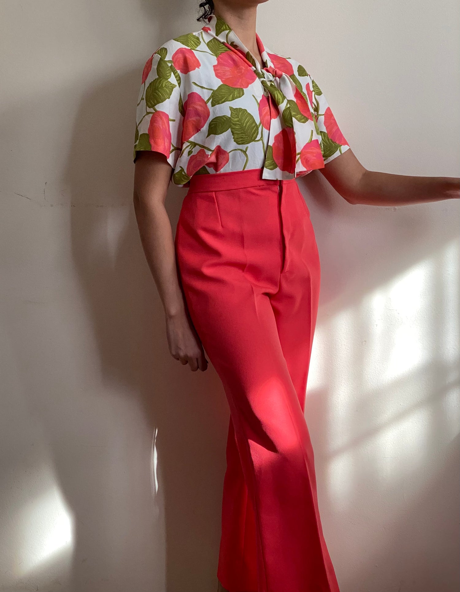 60's Colorful Floral Bow Short Sleeve Blouse (M)