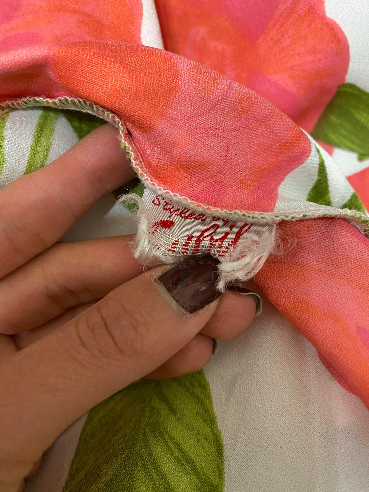 - Features: Short sleeve, button up, bow collar, v-neckline, lightweight & airy. Inside is stamped "TRITON FABRIC INC"