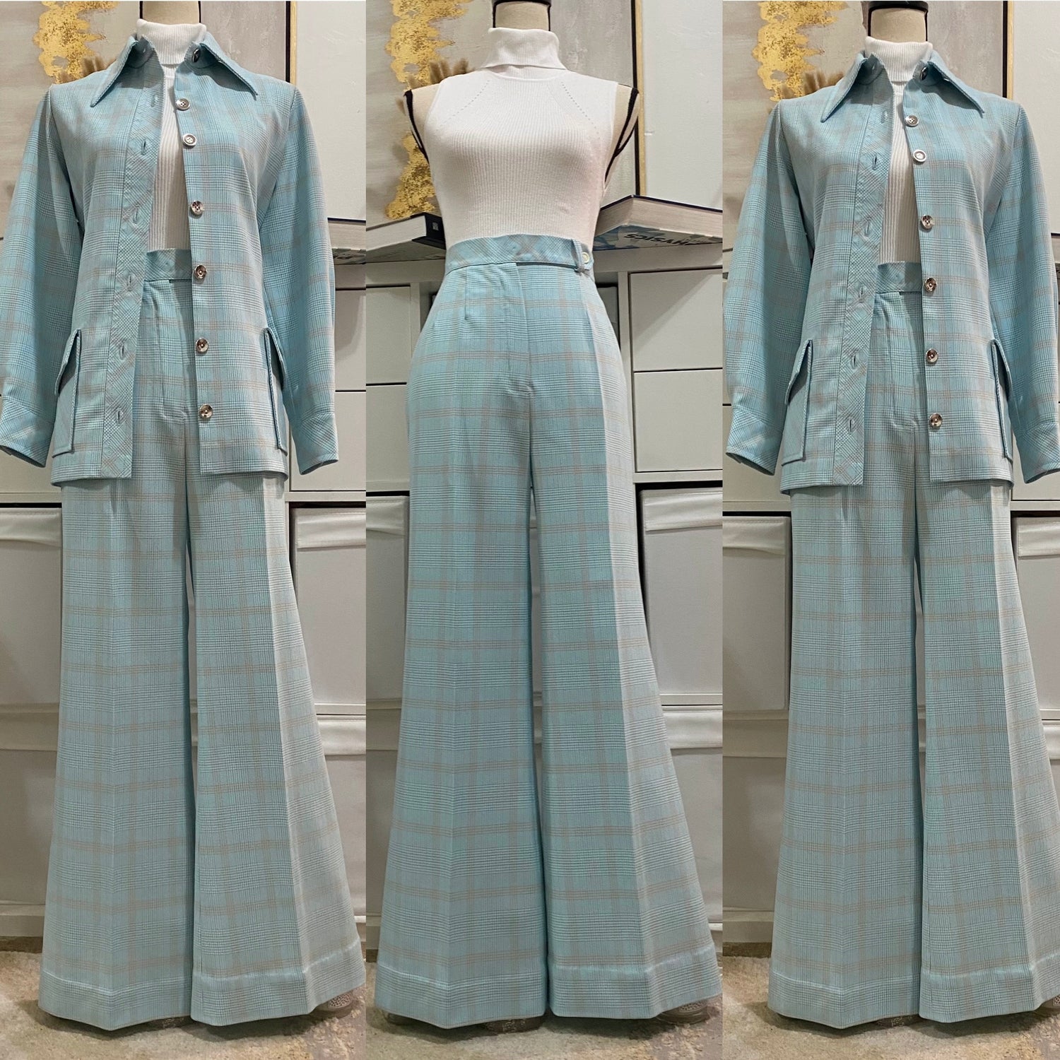 70's Blue Plaid 2Pc Bell Bottom Pantsuit (M, 29"W)