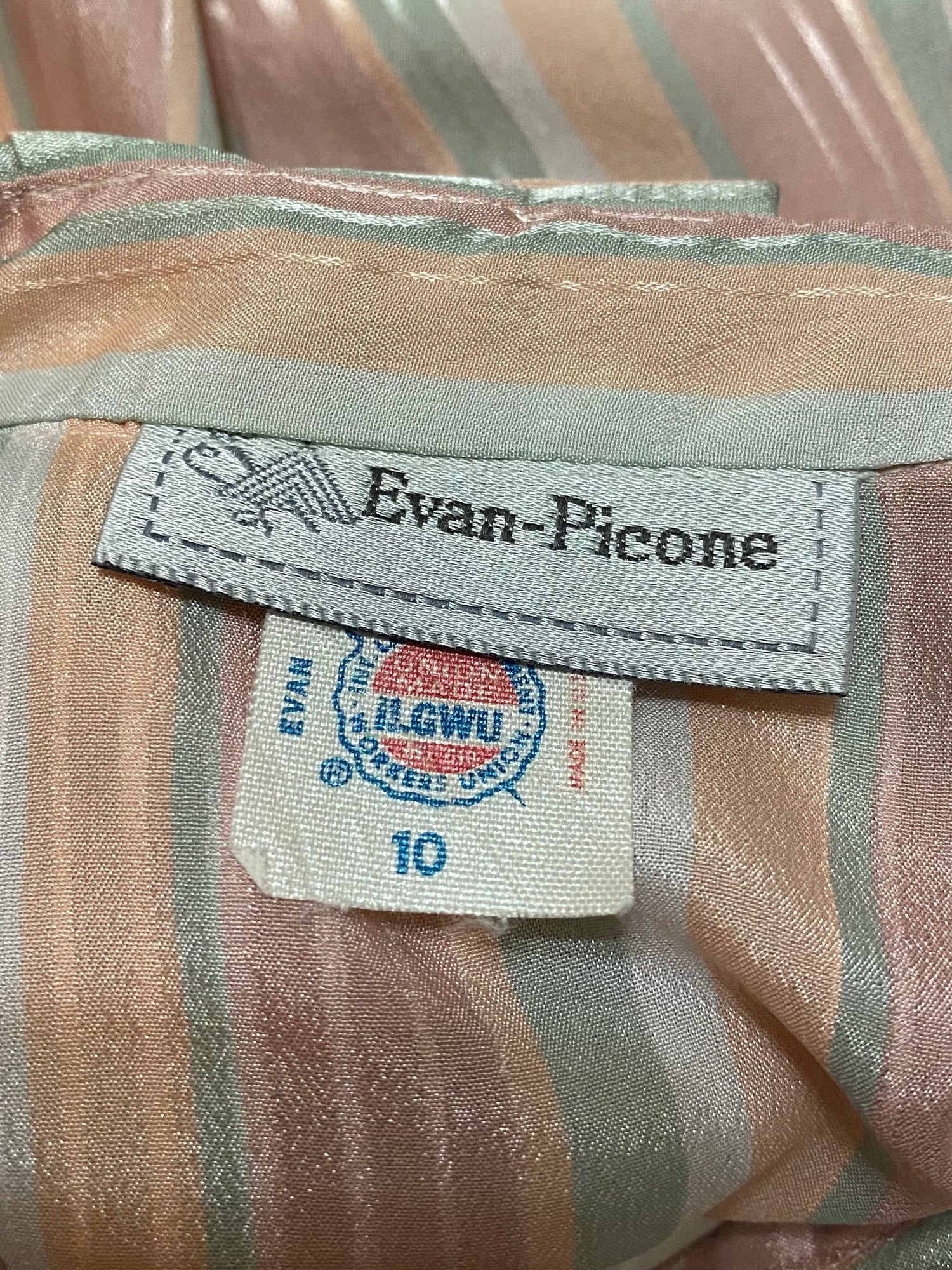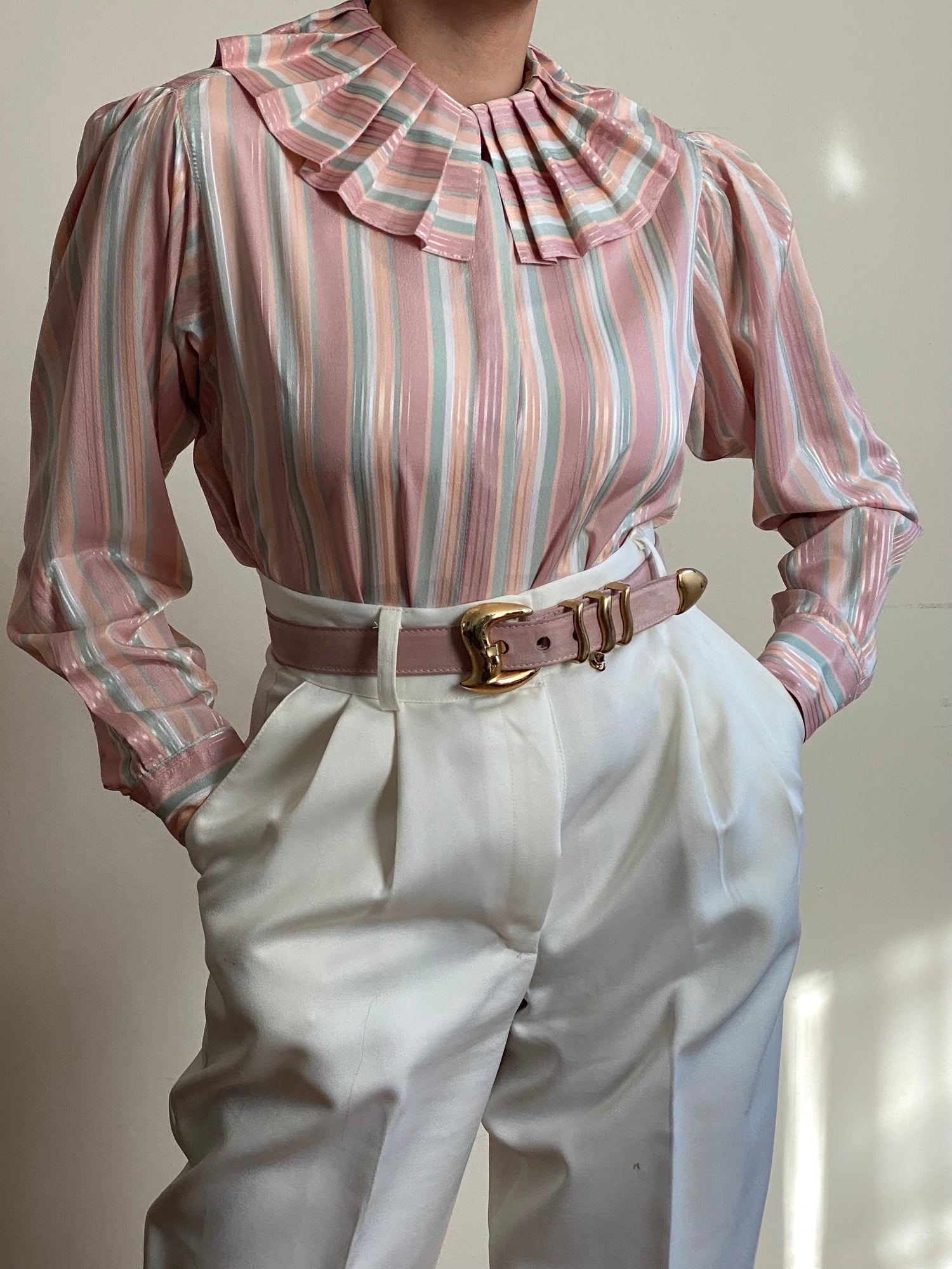 70's ILGWU Pastel Striped Round Pleated Collar Long Sleeve Blouse (S)