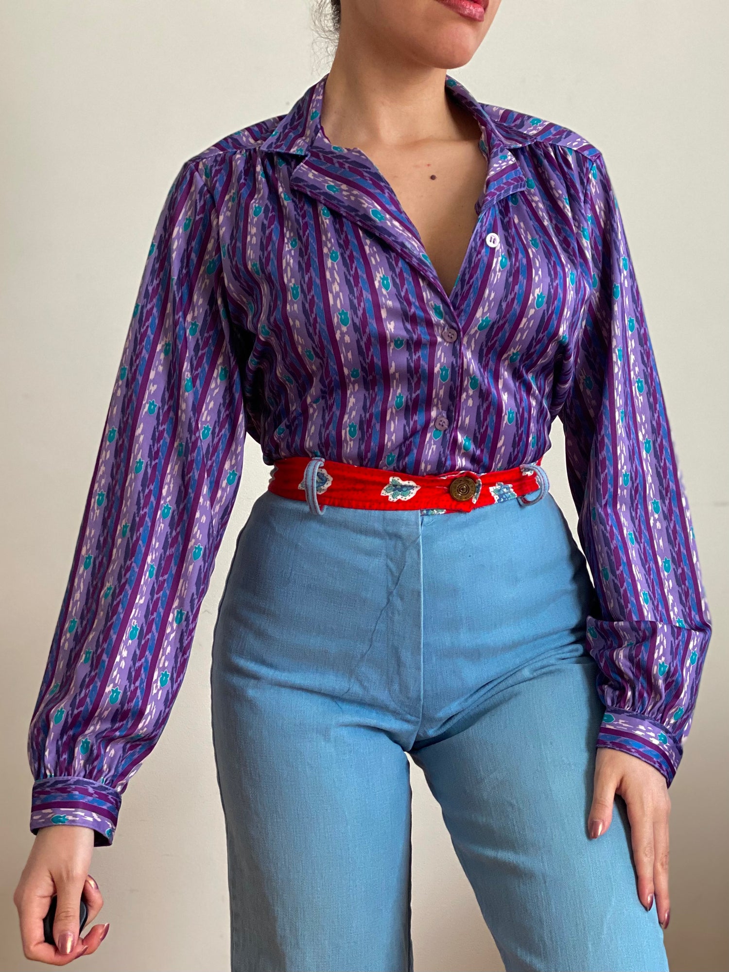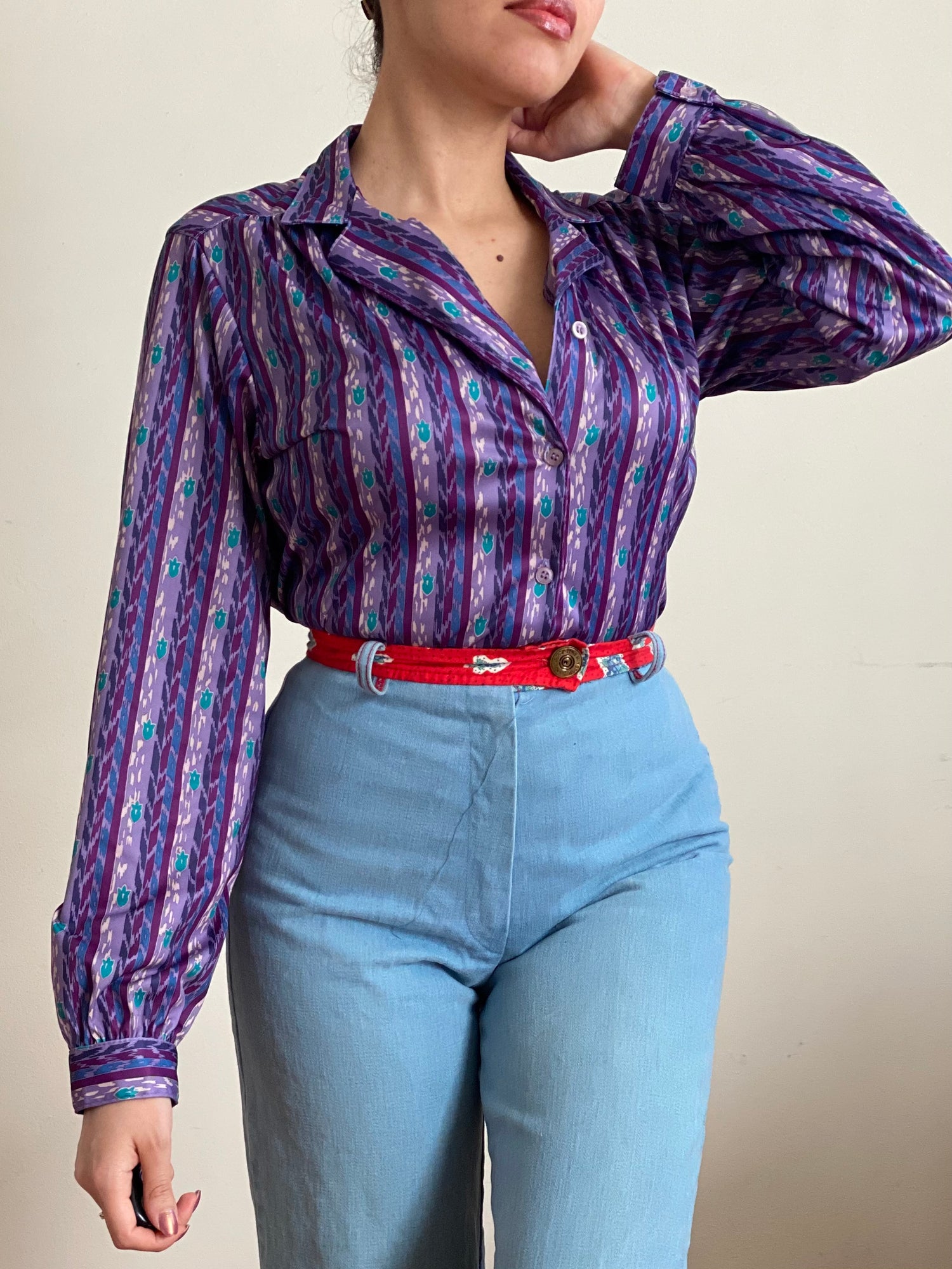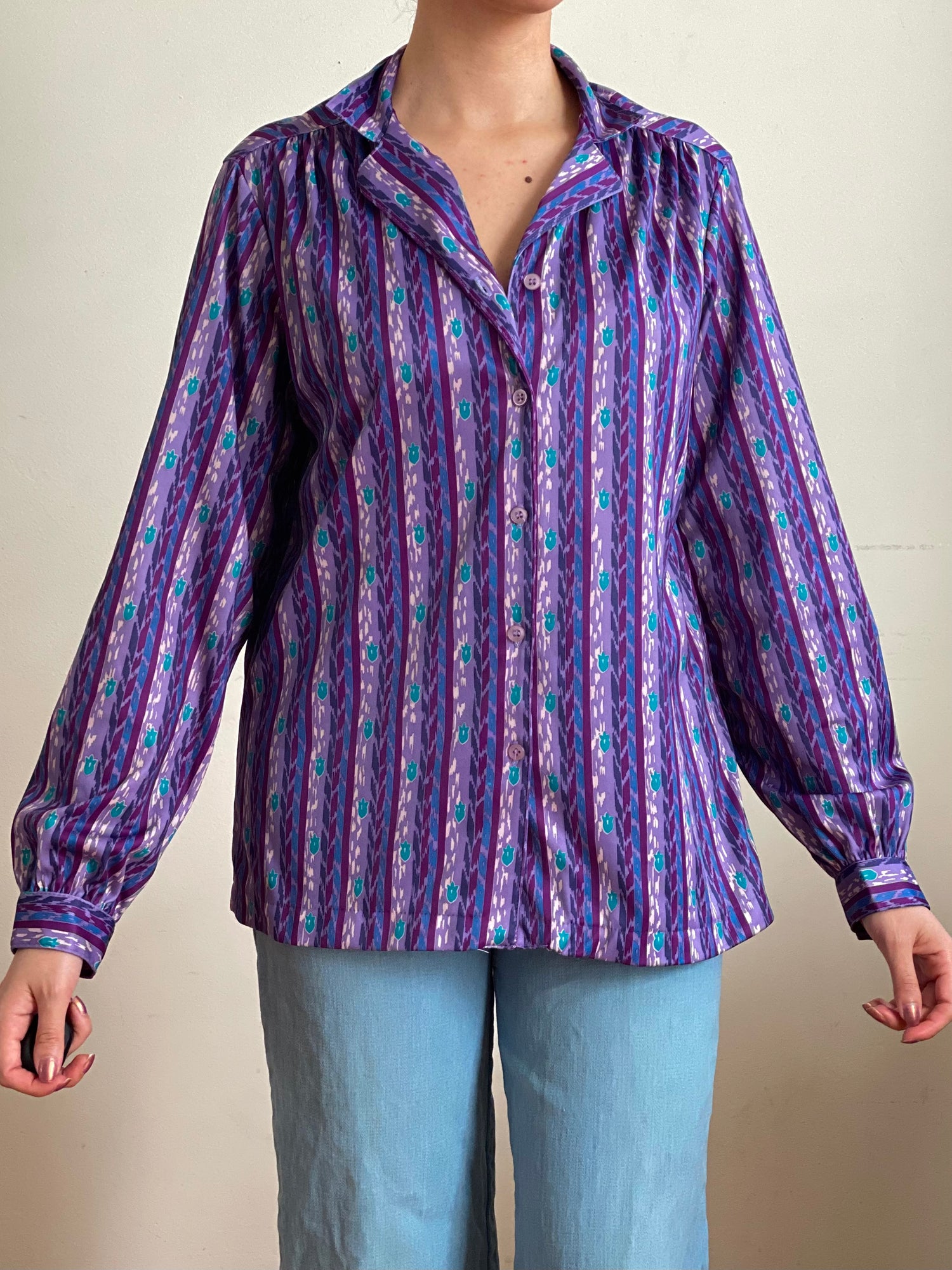 70's Purple Abstract Long Sleeve Blouse (S-M)