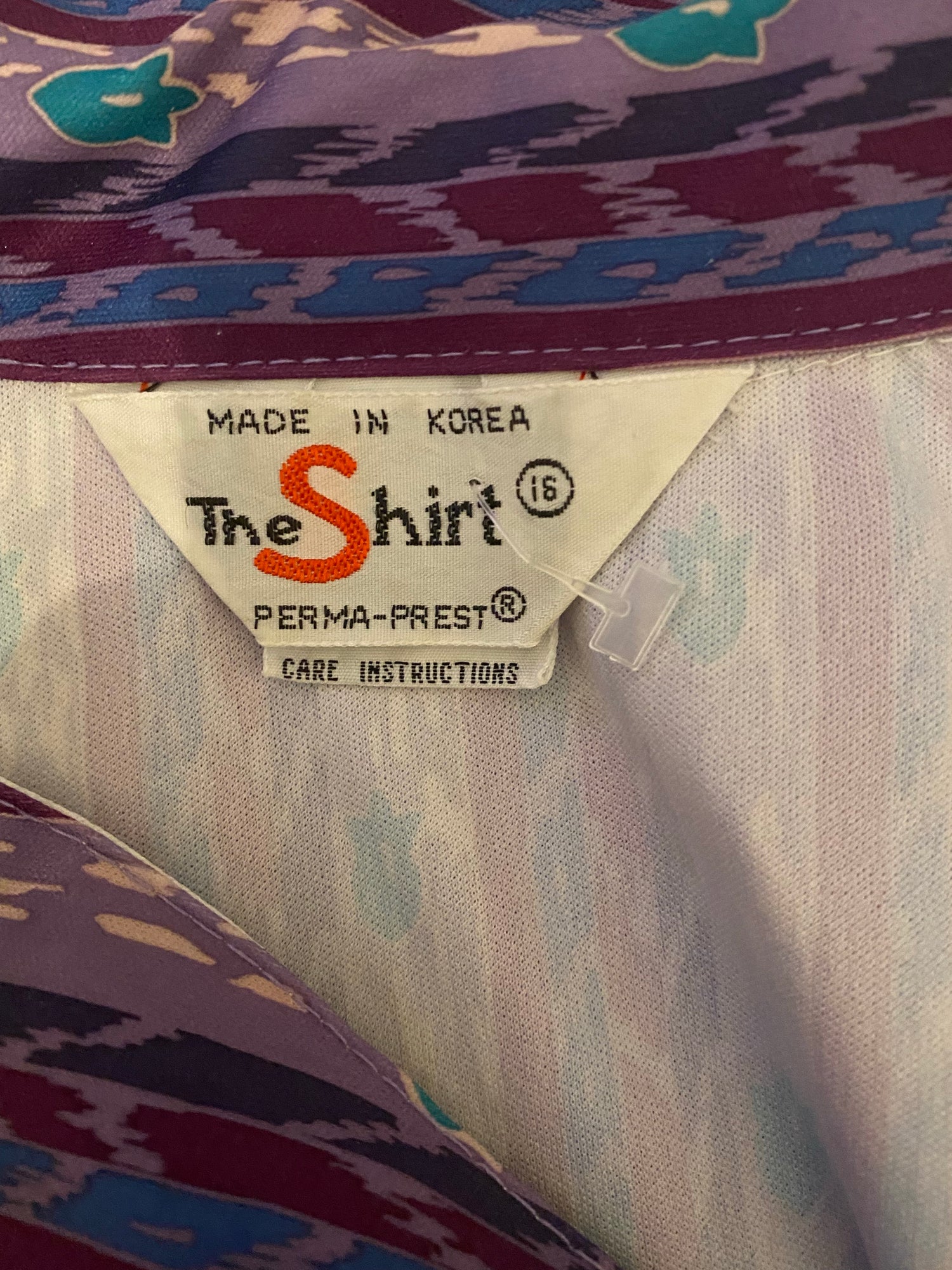 Details: Purple & teal long sleeve tulip/fish Blouse, button down style, button cuffs, v-neckline.