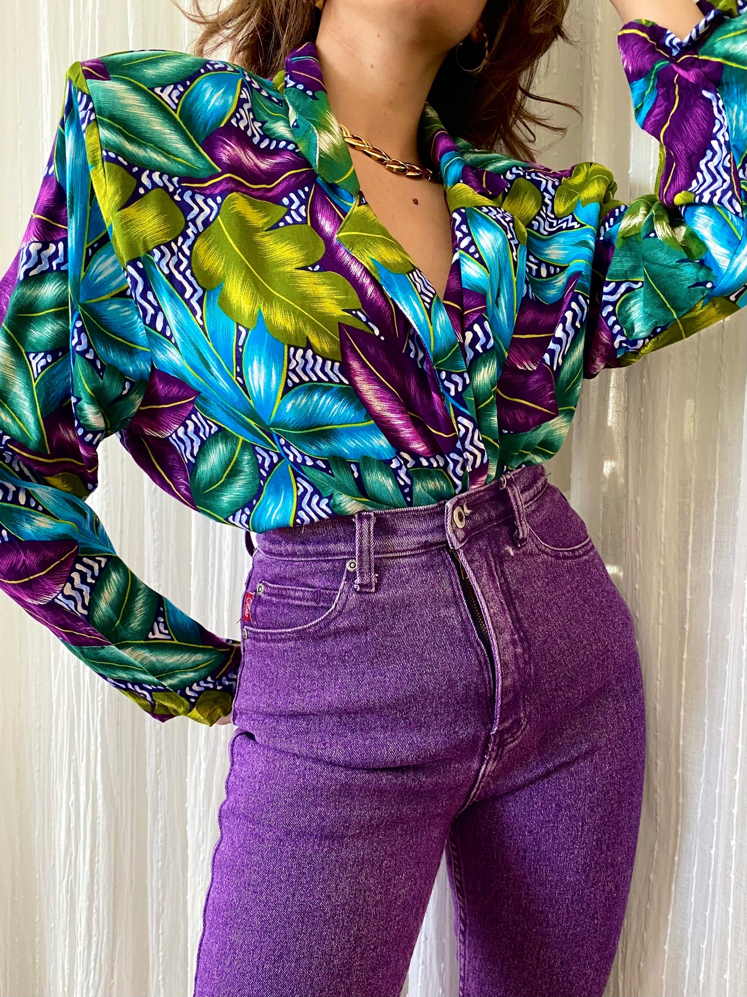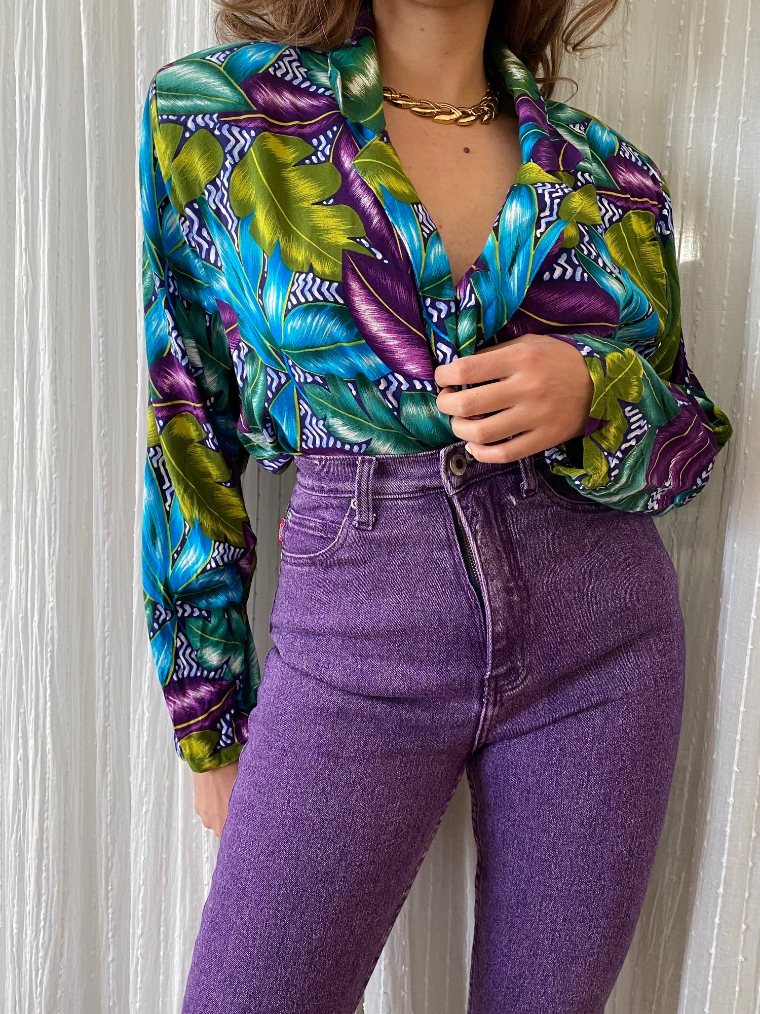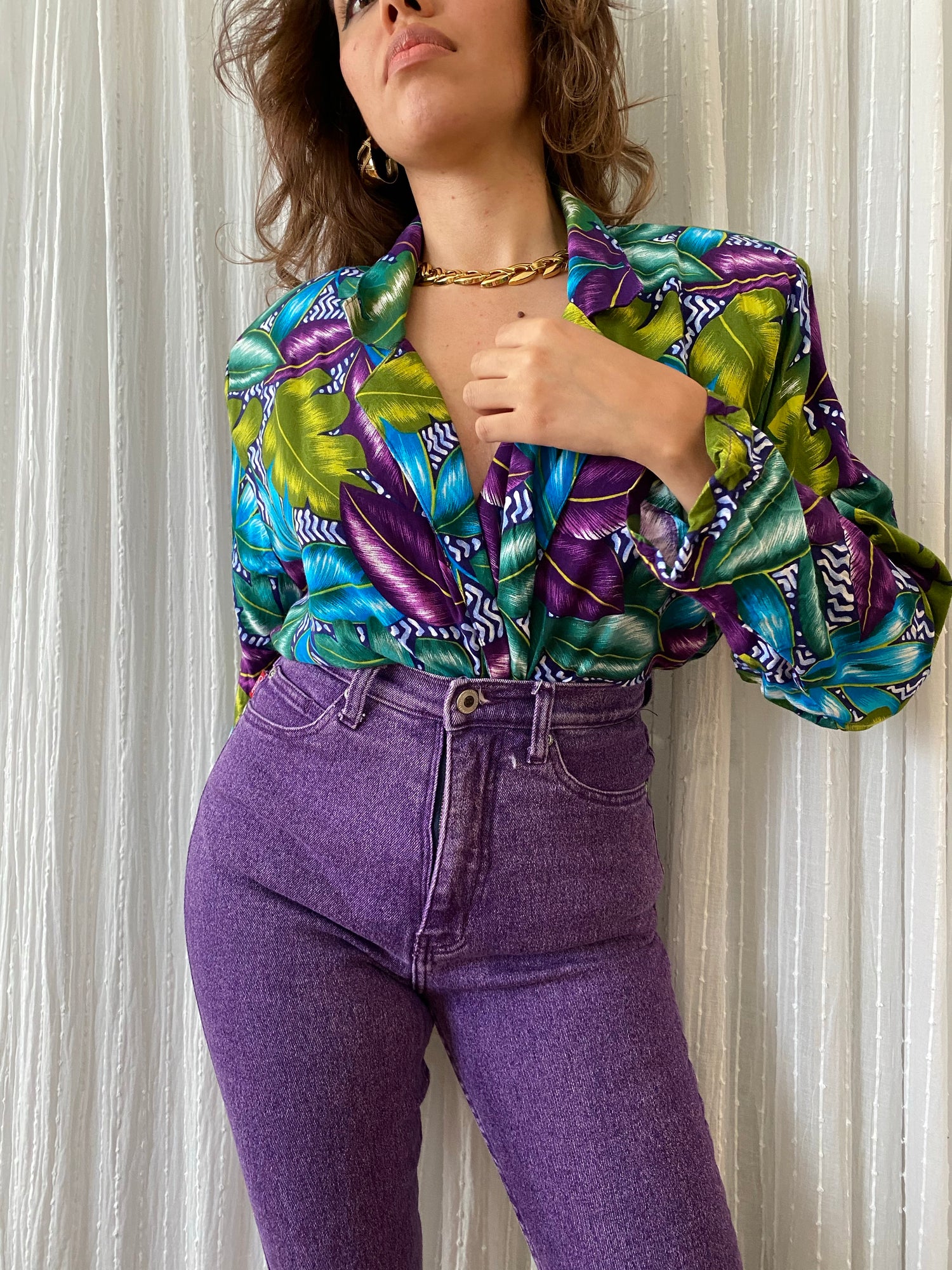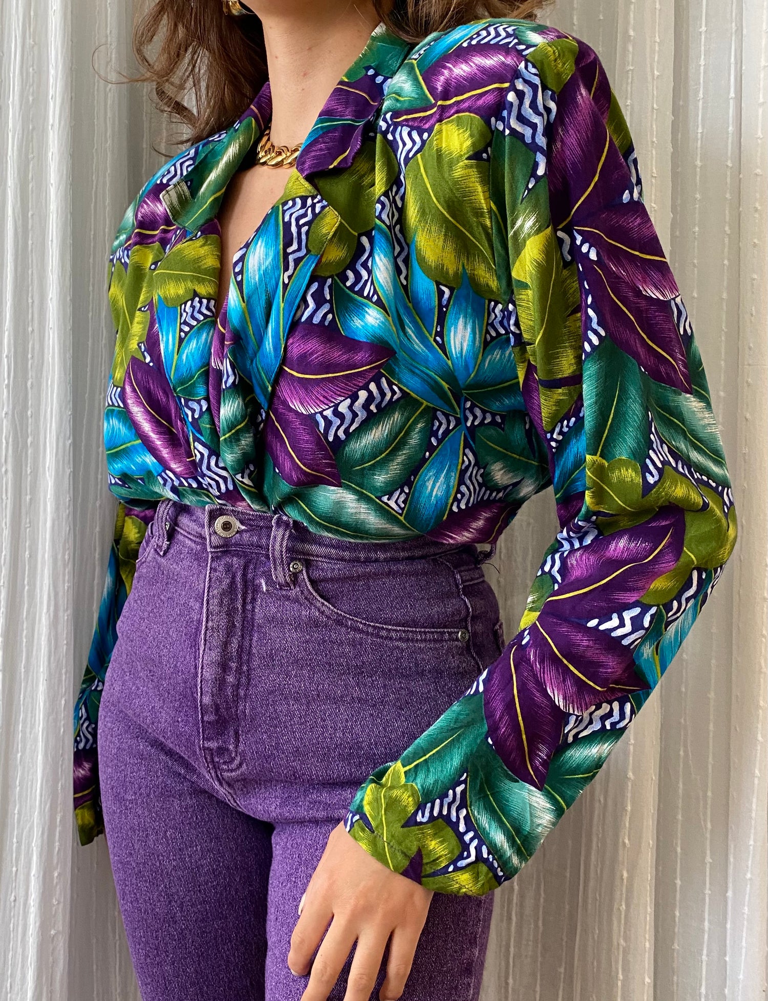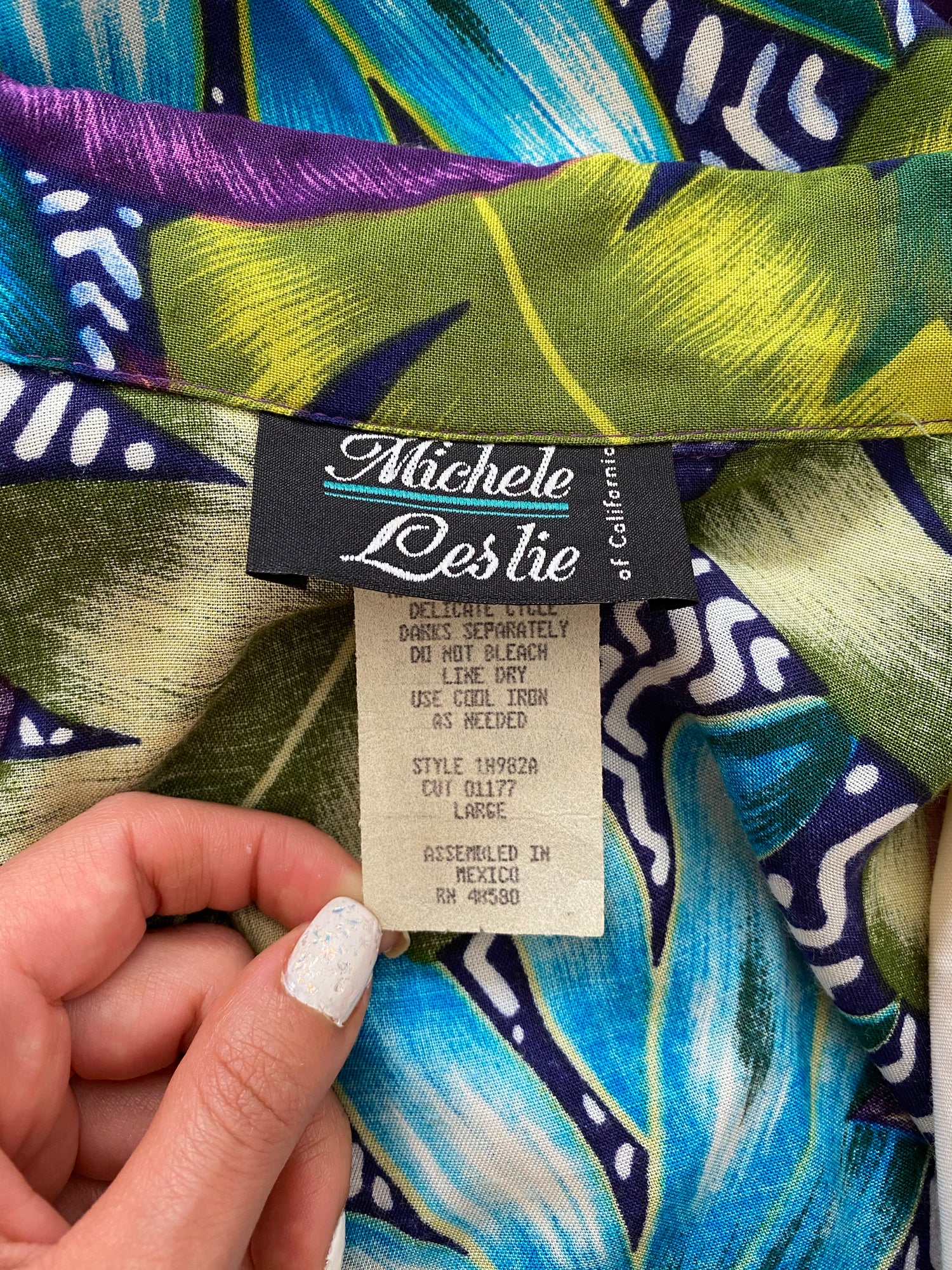 - Features: Floral/Hawaiian print, shoulder pads, center button closure, long sleeve, bottom pockets on both front sides, super soft.