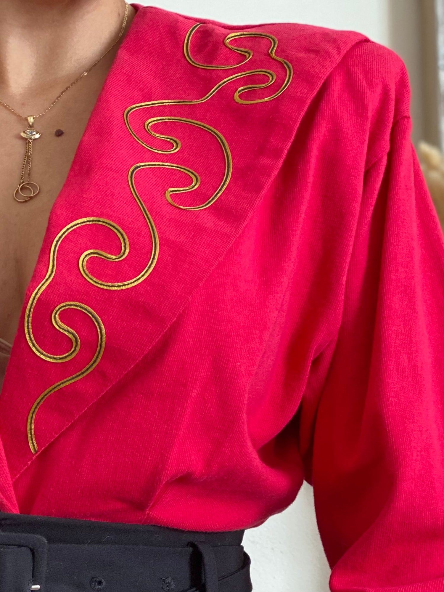 - Features: Two front buttons, deep V front cut, long sleeve, shoulder pads
