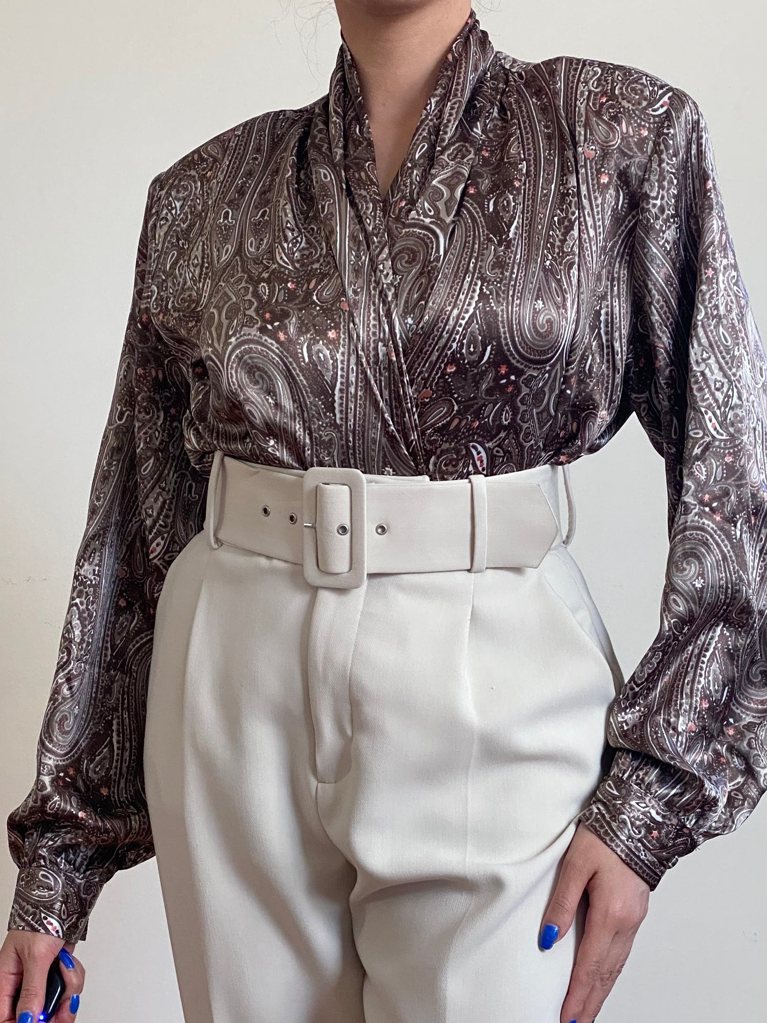 80'a Satin Draped V-Neck Abstract Blouse (M-L)
