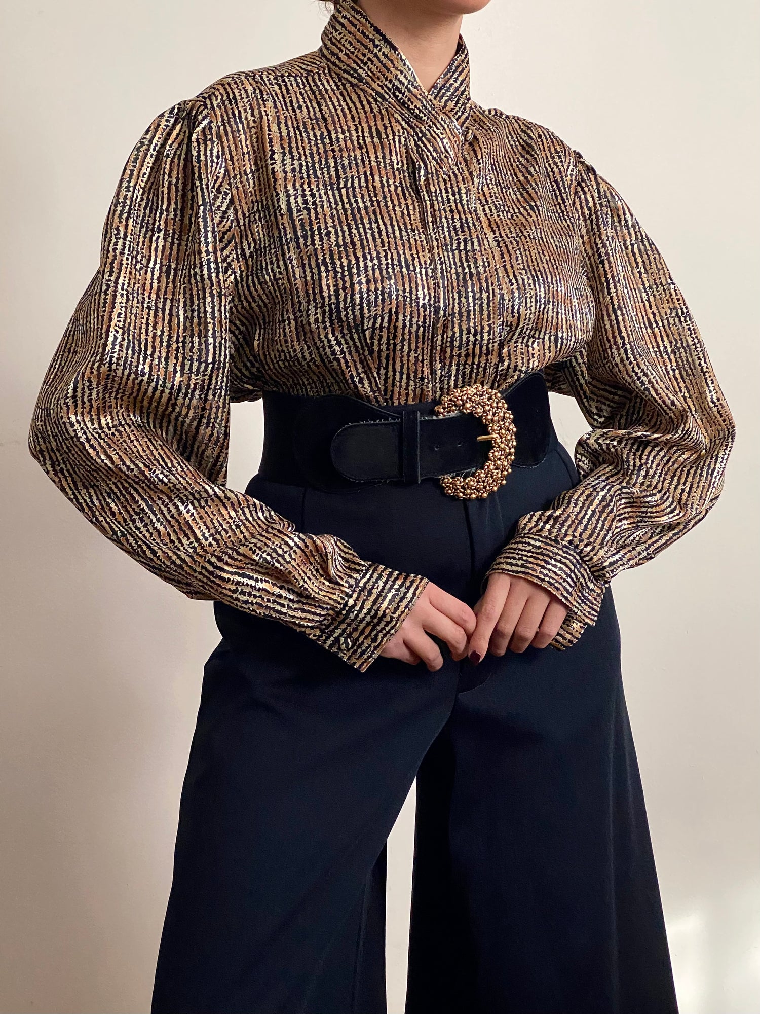 80's Gold Mandarin Collar Long Sleeve Blouse (M)