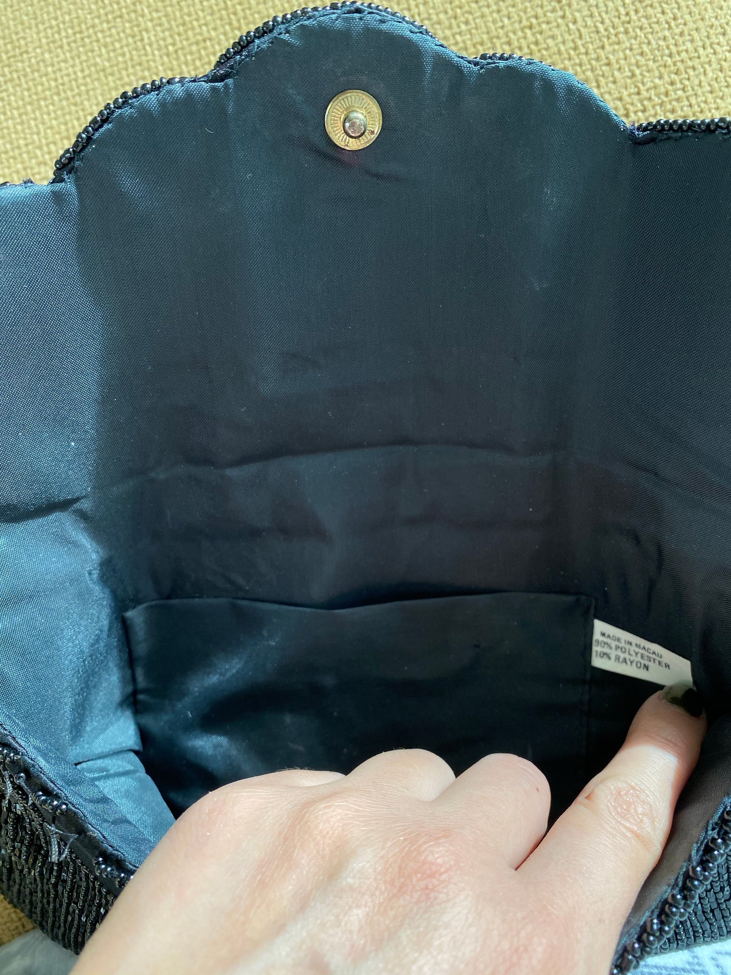 Vintage handmade beaded clutch. Made in Macau. Features a scalloped design, magnet closure.
