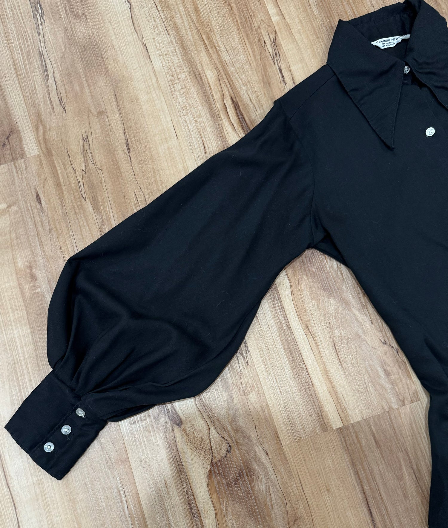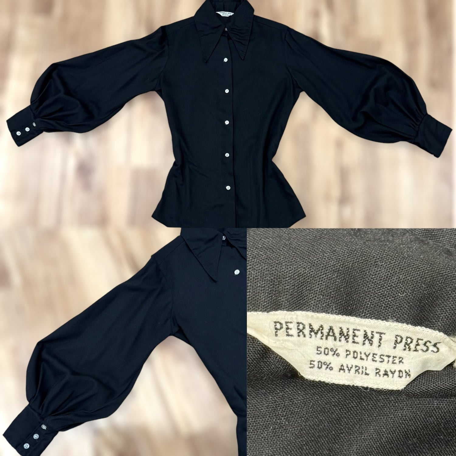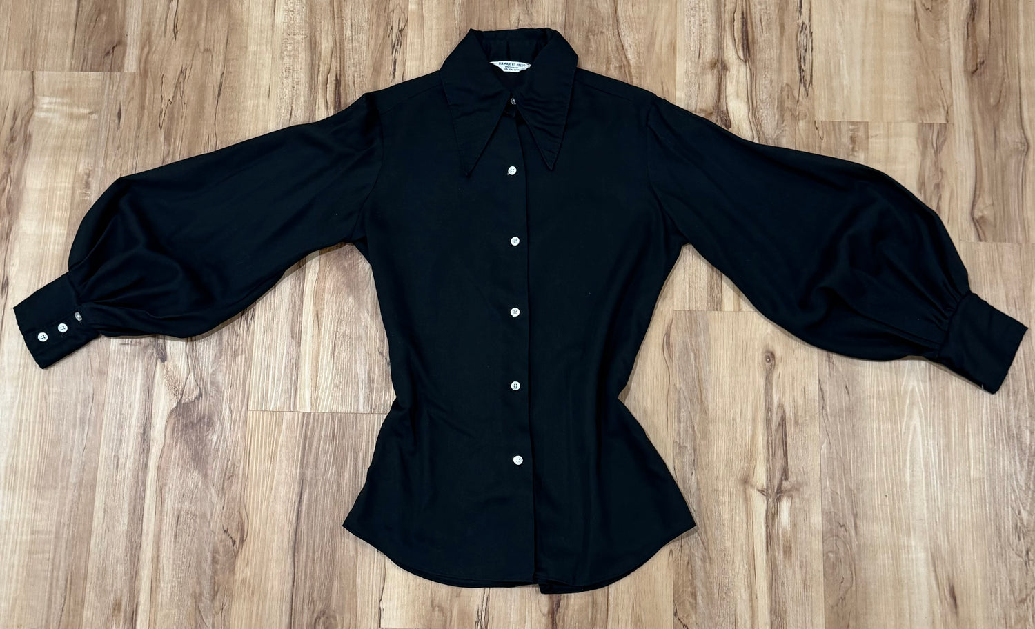 1970s slightly sheer black top with gorgeous bishop sleeves. Three button cuff with a puff sleeve. Buttons at the front.