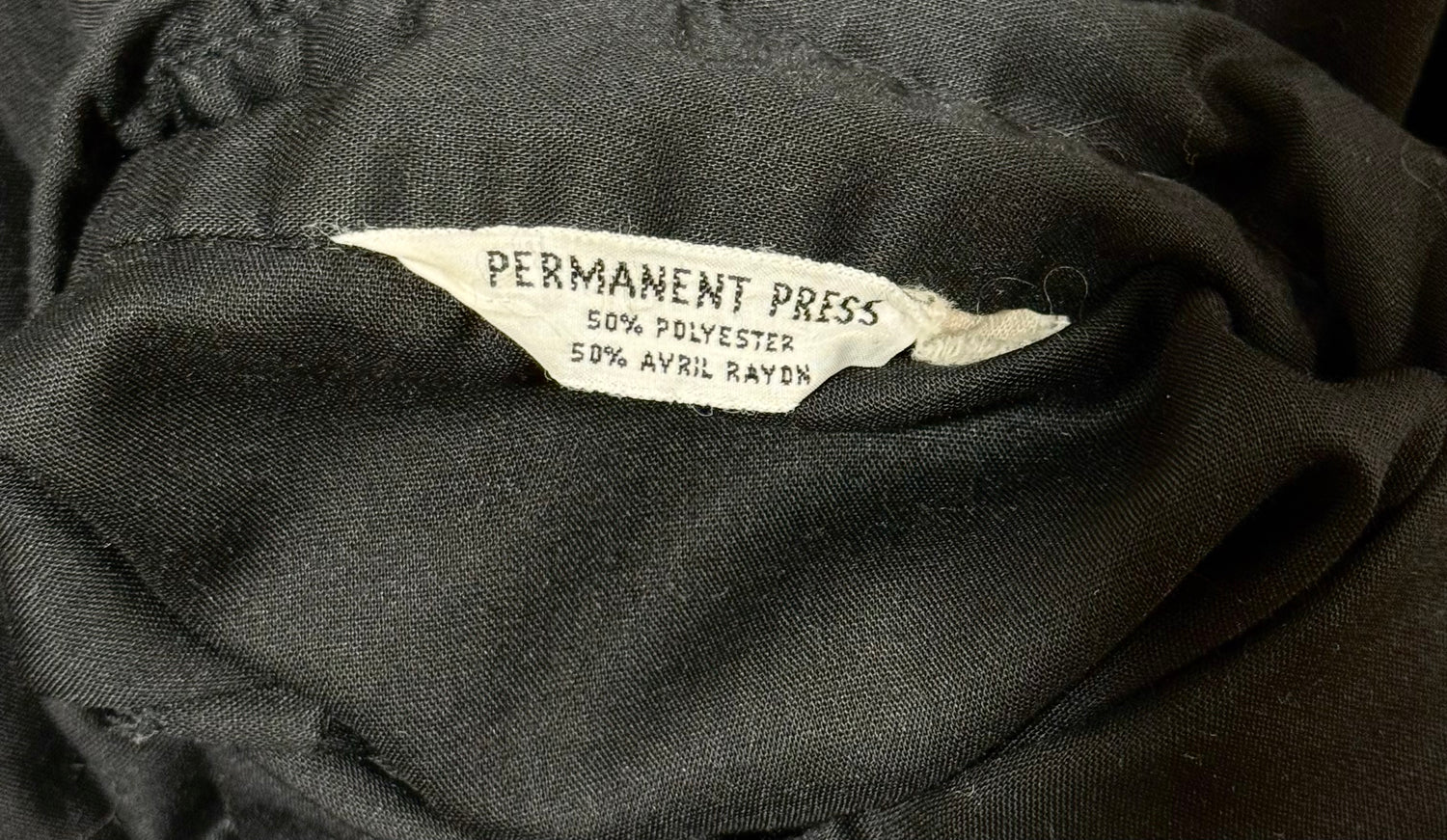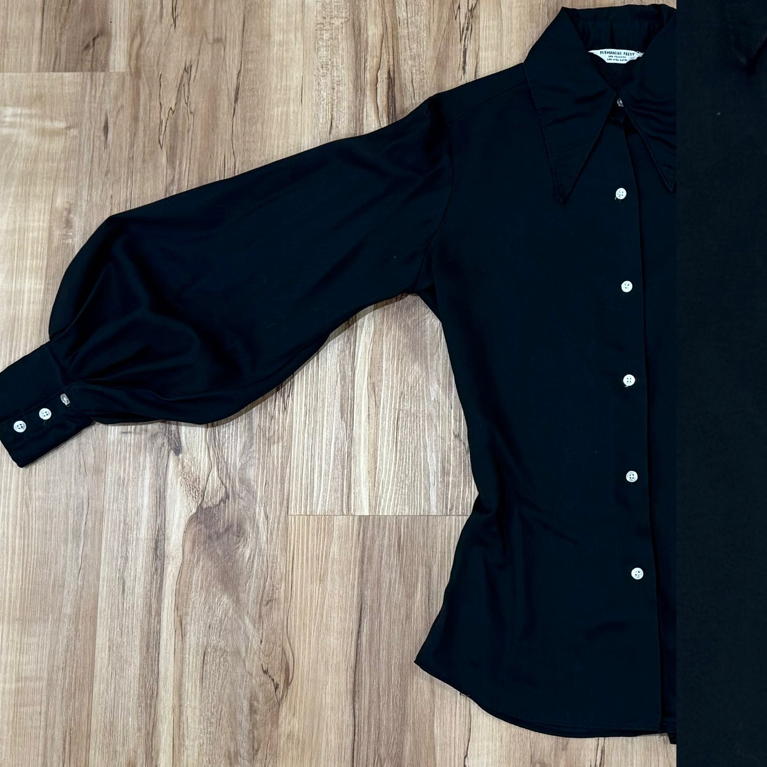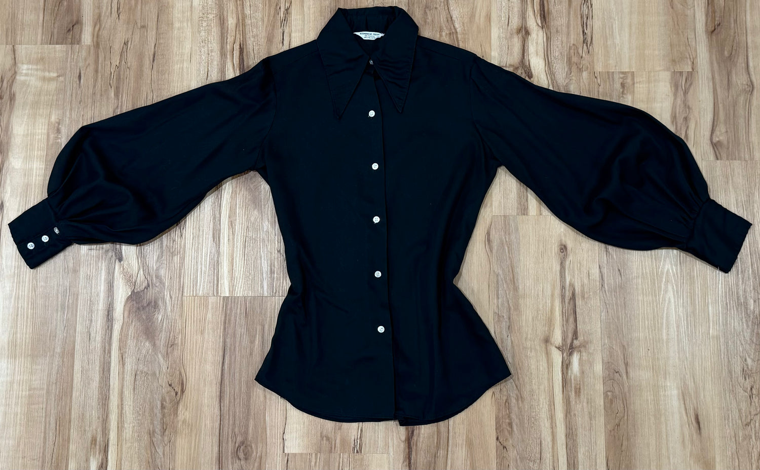 1970s slightly sheer black top with gorgeous bishop sleeves. Three button cuff with a puff sleeve. Buttons at the front.