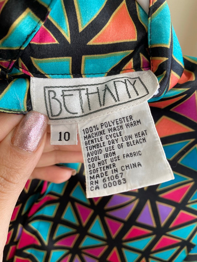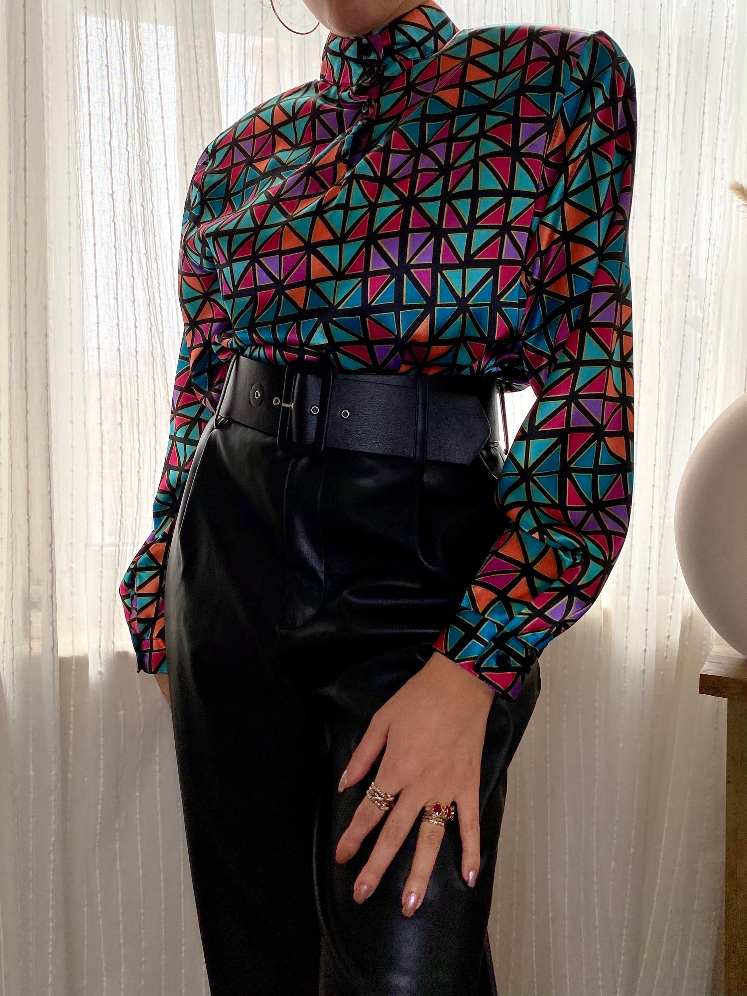 - Features: long sleeve, buttons on the collar, fun geometric print.