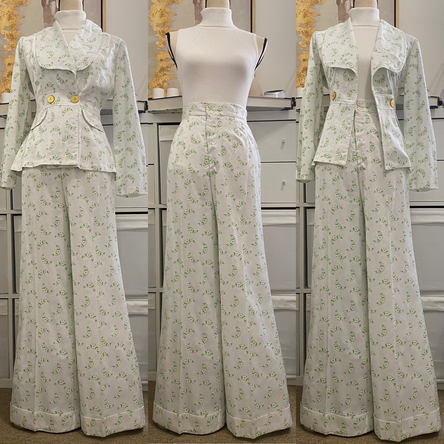 Gorgeous 60s-70s 2-piece pantsuit. Dainty floral pattern featured throughout the pieces. Made from a breathable and comfortable material, this set is ideal for the warm months.