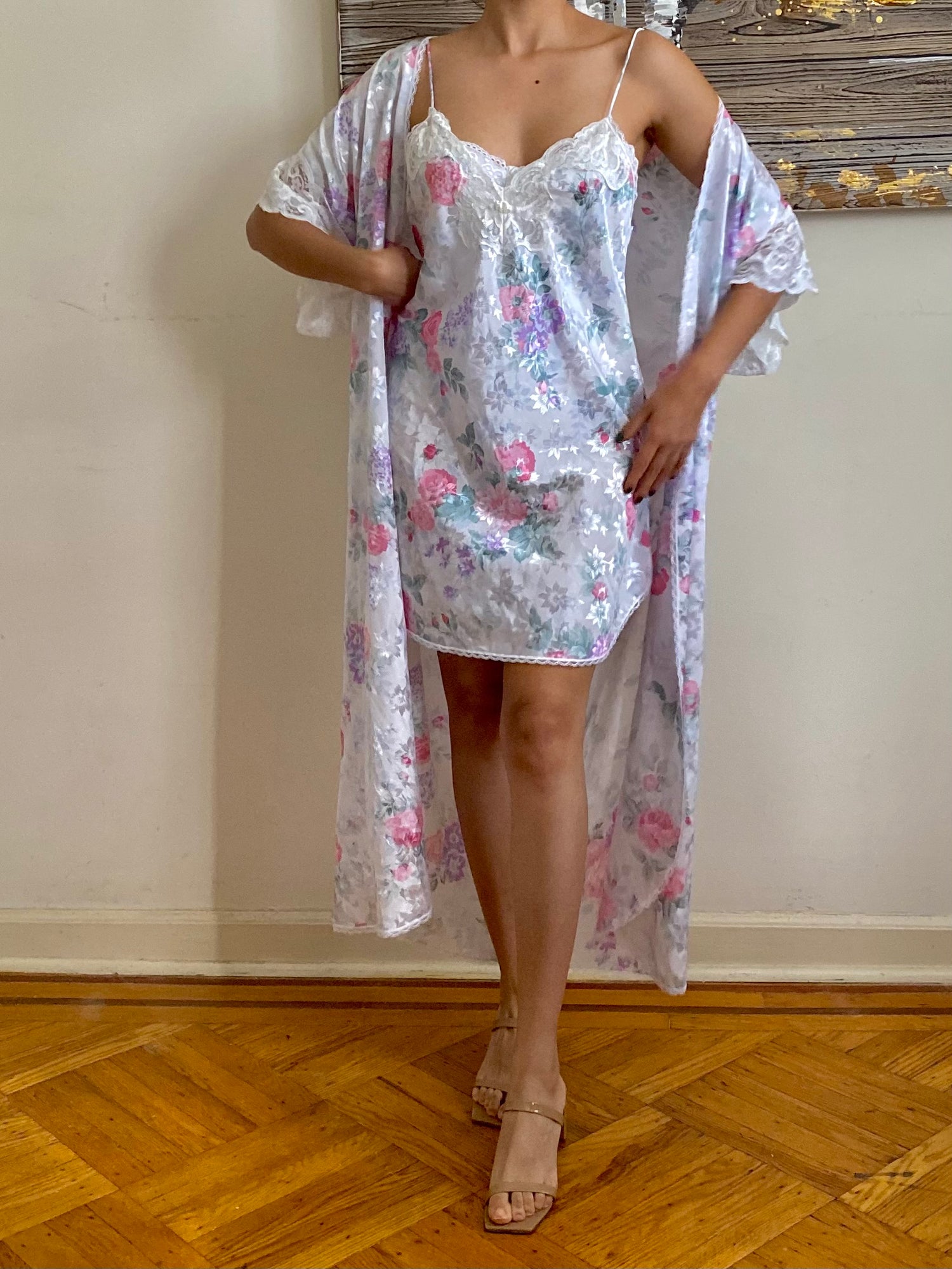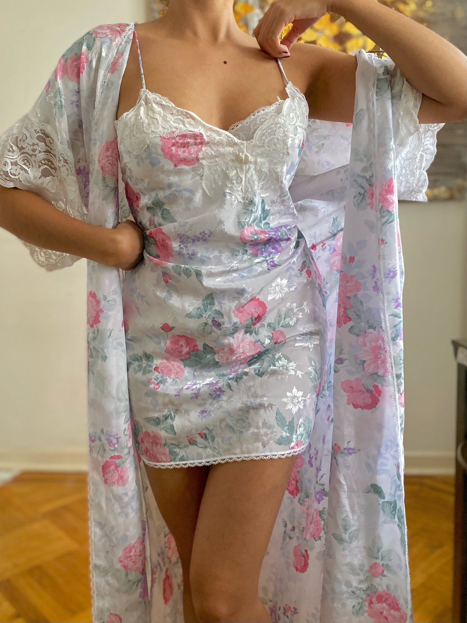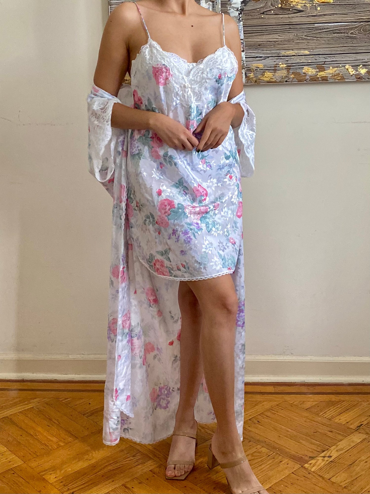 - Features: Made in the USA, lace trim across the bust in the slip & around the sleeves i the robe, mini length (slip), full length (robe)
