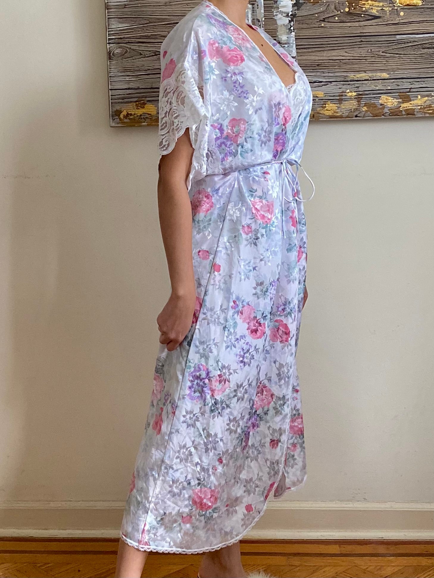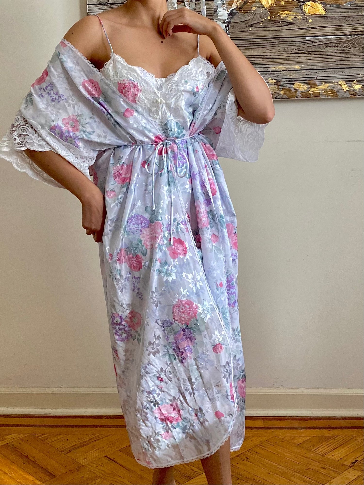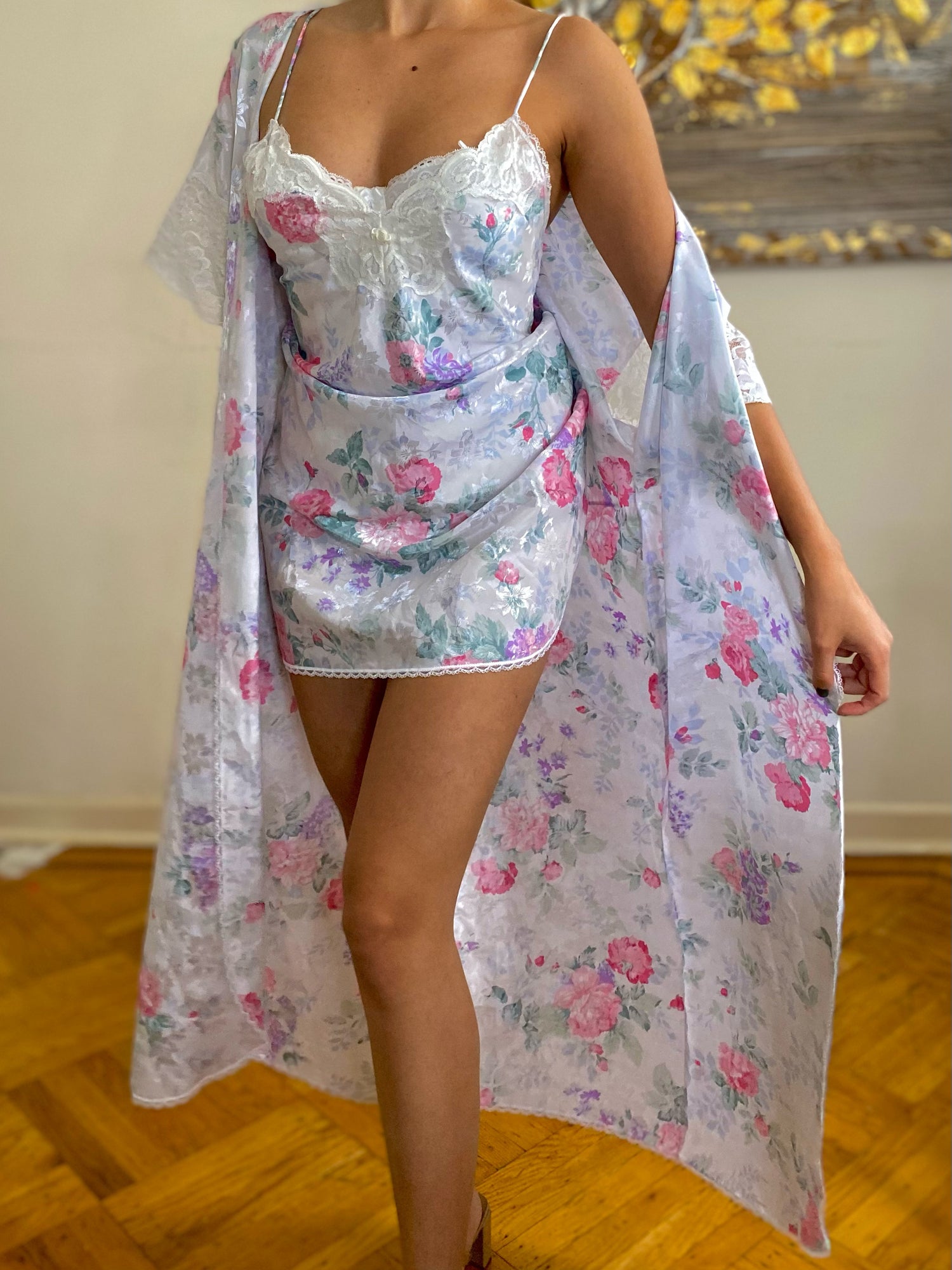 - Features: Made in the USA, lace trim across the bust in the slip & around the sleeves i the robe, mini length (slip), full length (robe)