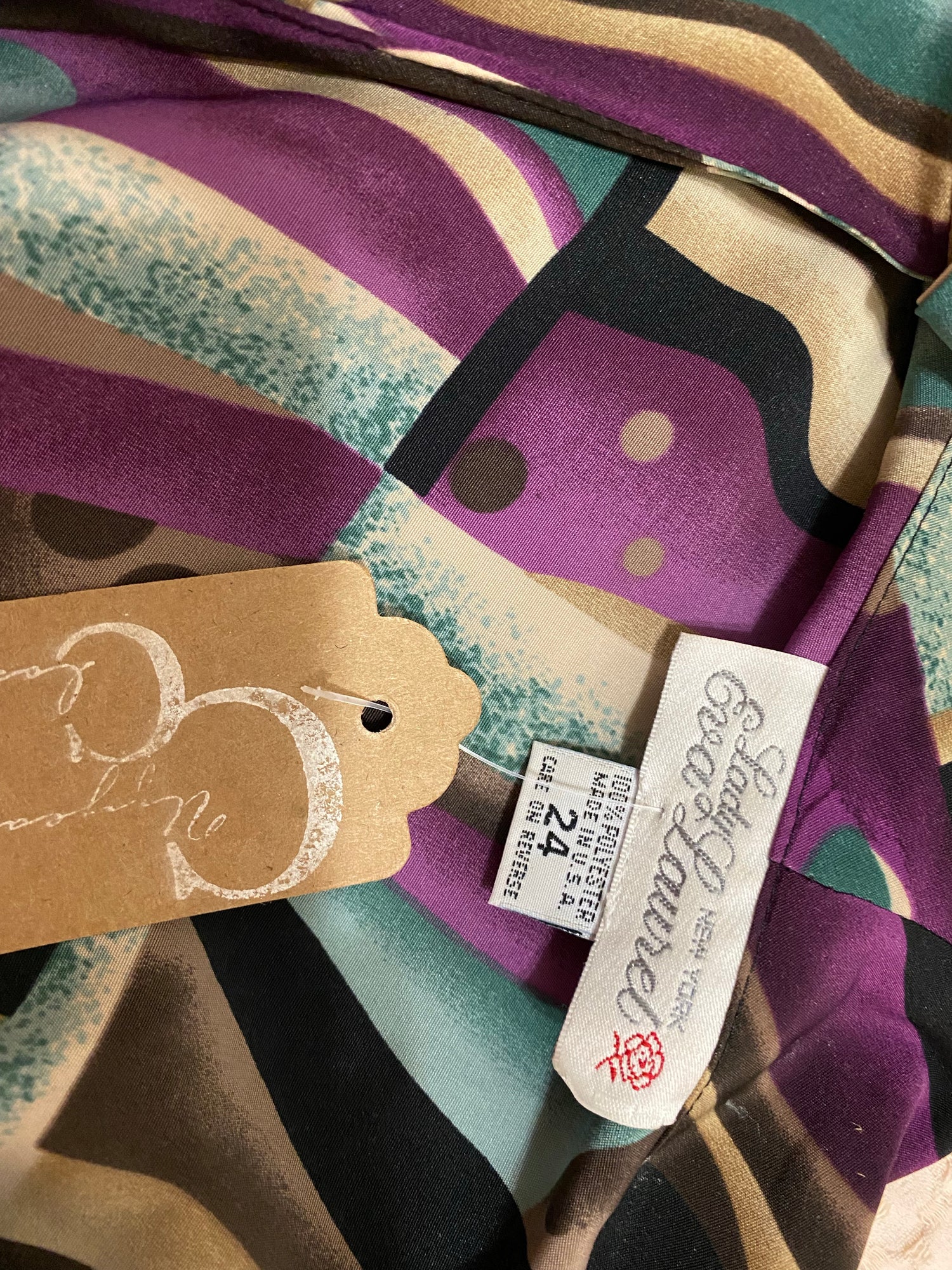 Features: Button down, jabot collar, button cuffs, long sleeve, Made in the USA.