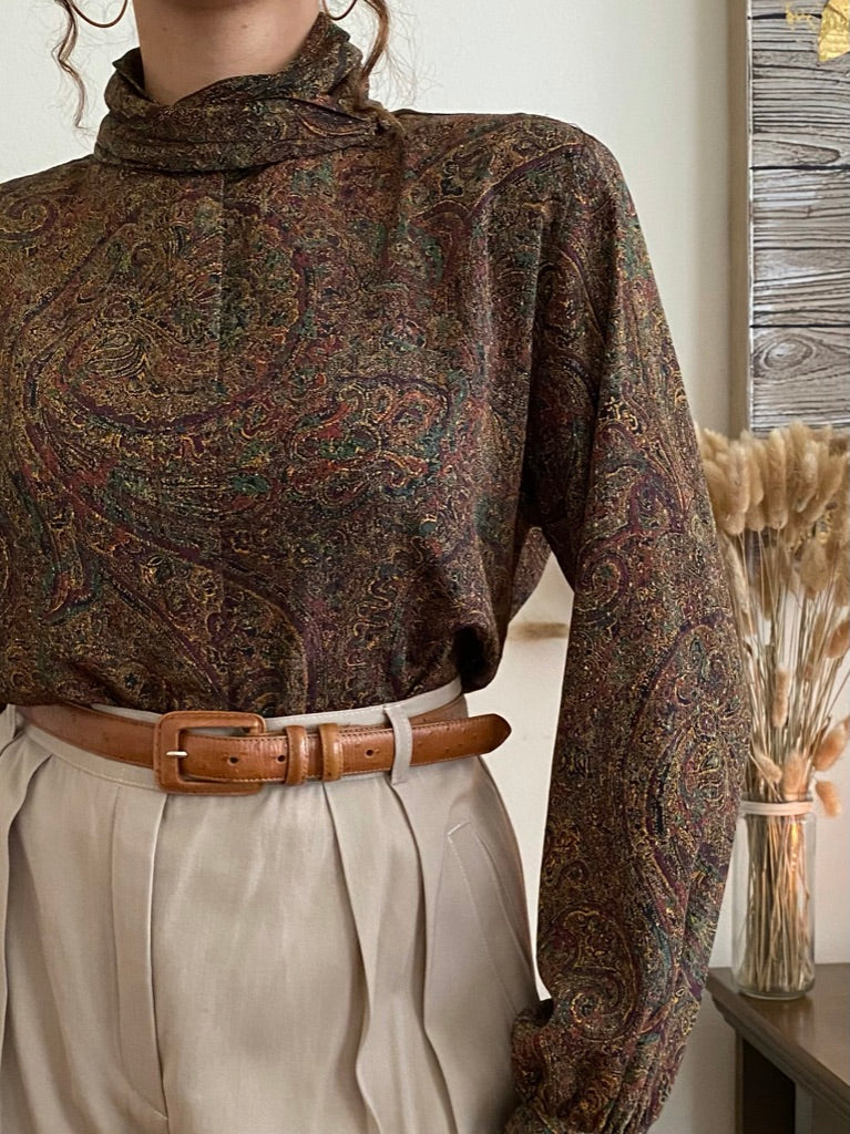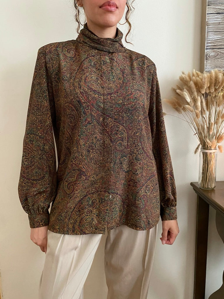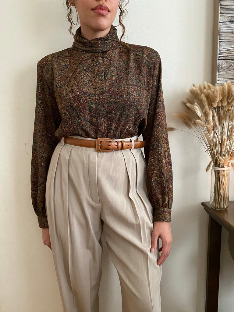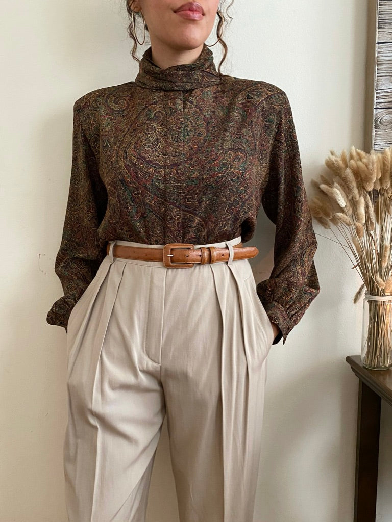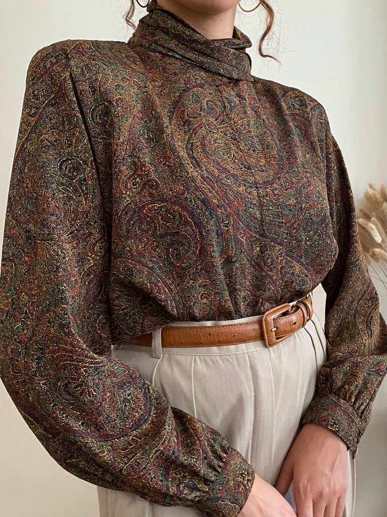 - Features: long sleeve, button down, high neck with side single button closure, slightly puffed sleeves, shoulder pads.