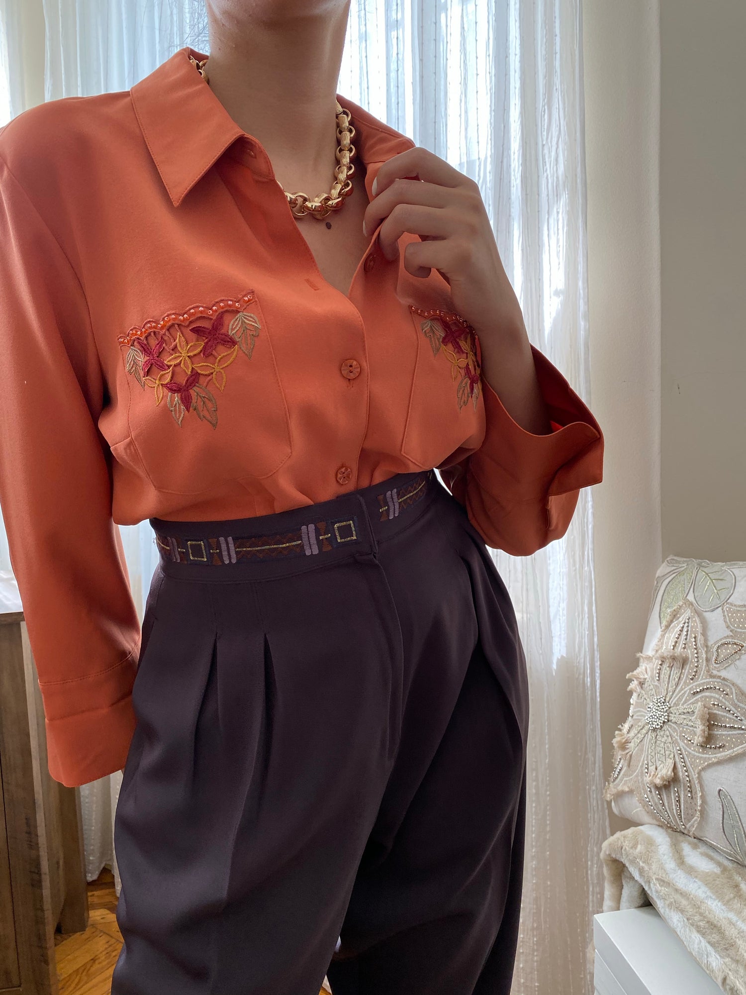 - Features: Flower embroidered (also beaded) front pockets, button down style, long sleeves, button on cuffs.