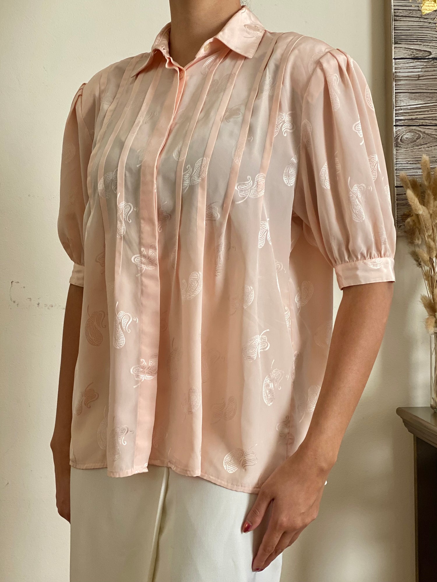 Button down Paisley Design Puff Short Sleeve Blouse (S)
