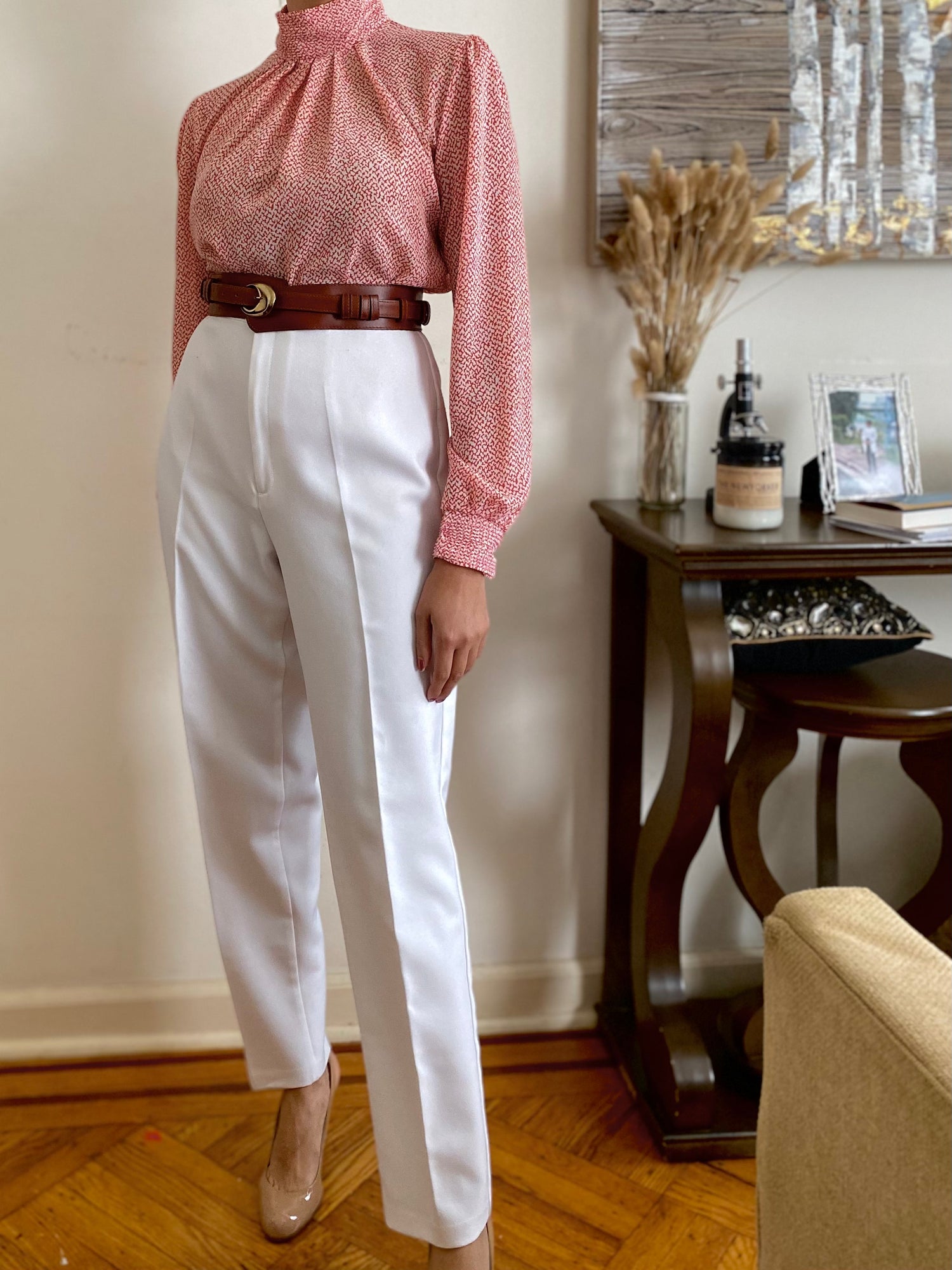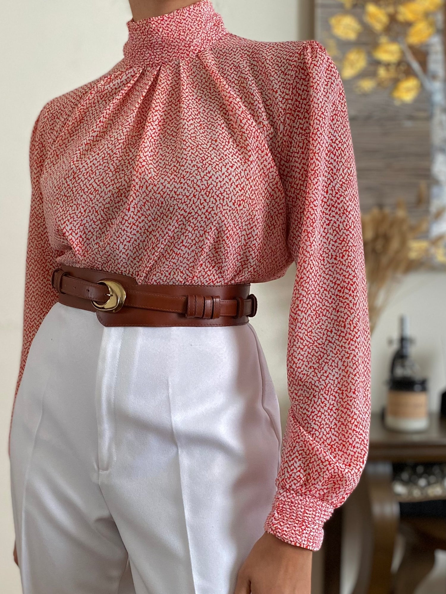 - Features: Somewhat sheer, long sleeve, high mock neck with back button closure. Gorgeous front pleat design. Made in the USA