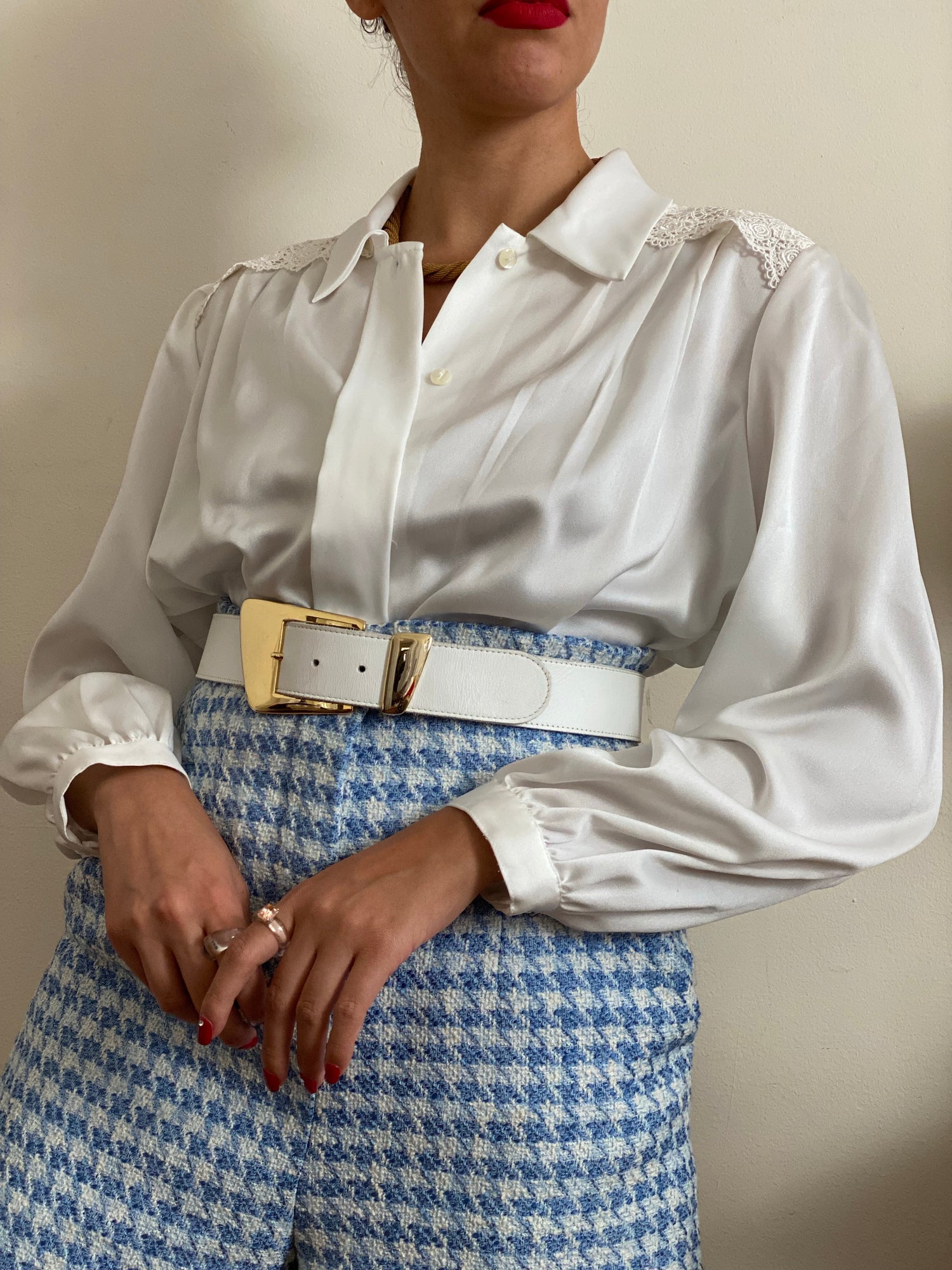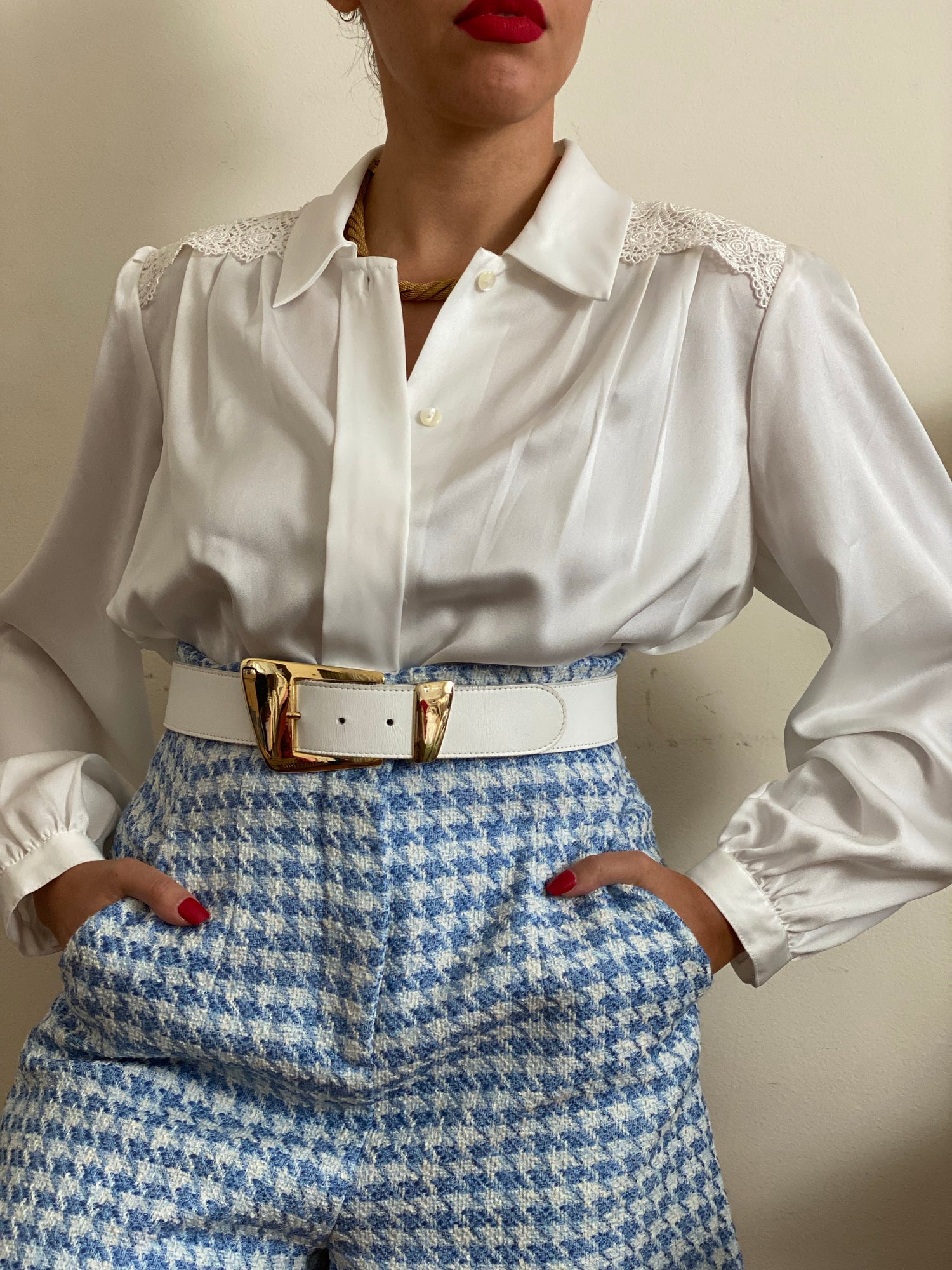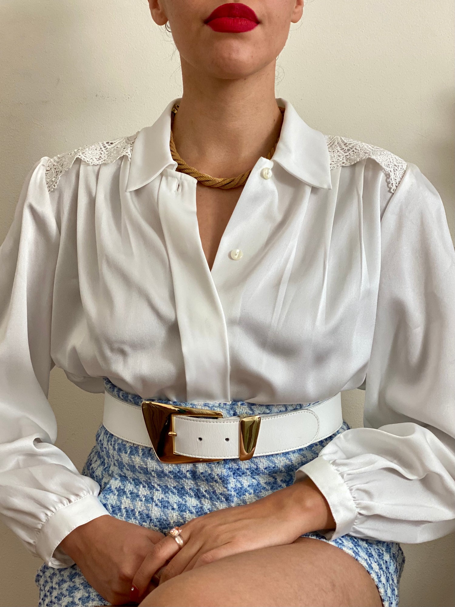 - Features: Button down, button cuffs, long sleeves, lace detailing in the shoulder area, small shoulder pads