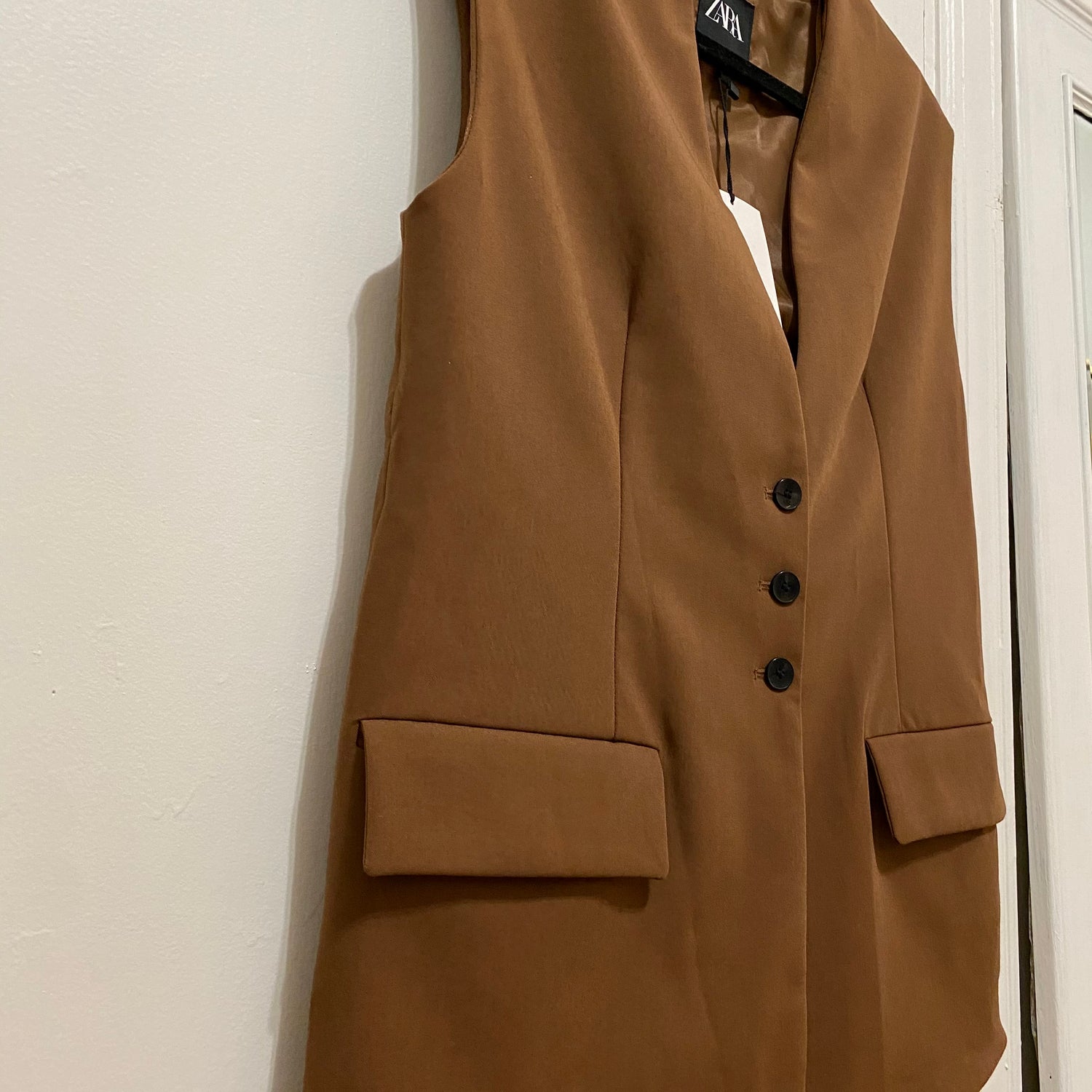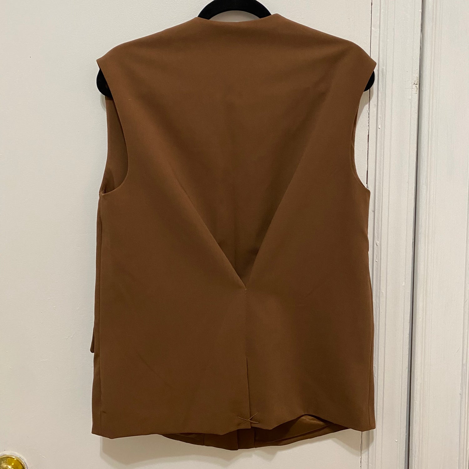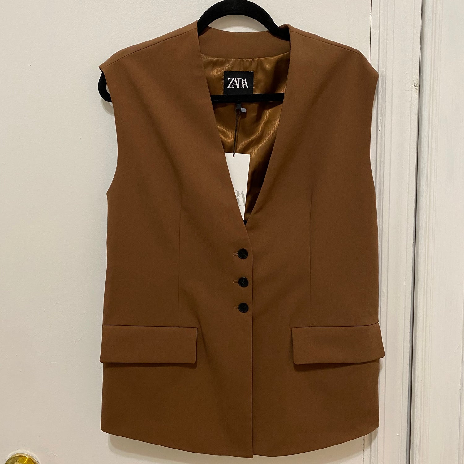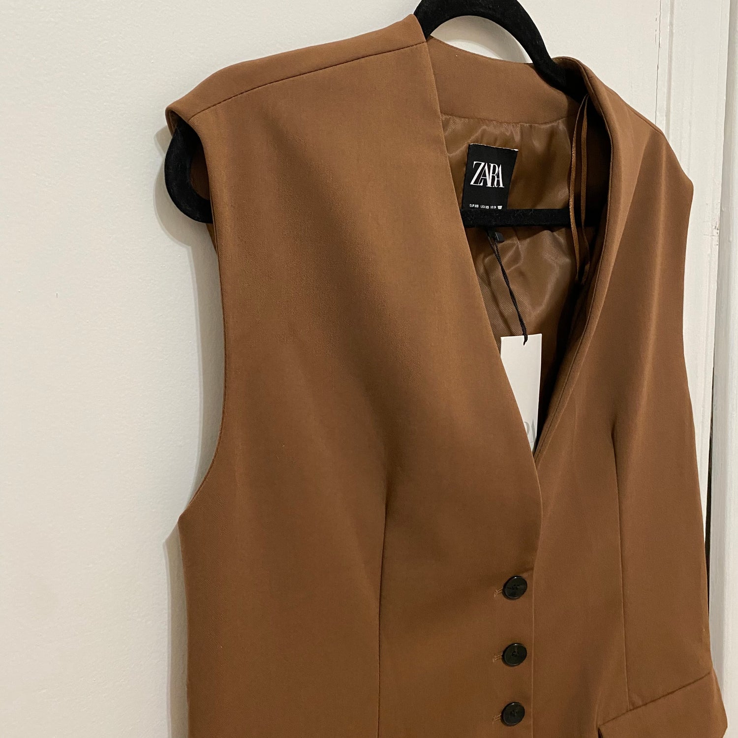 Chocolate brown Zara long, sleeveless vest. Features three closure buttons in the front.