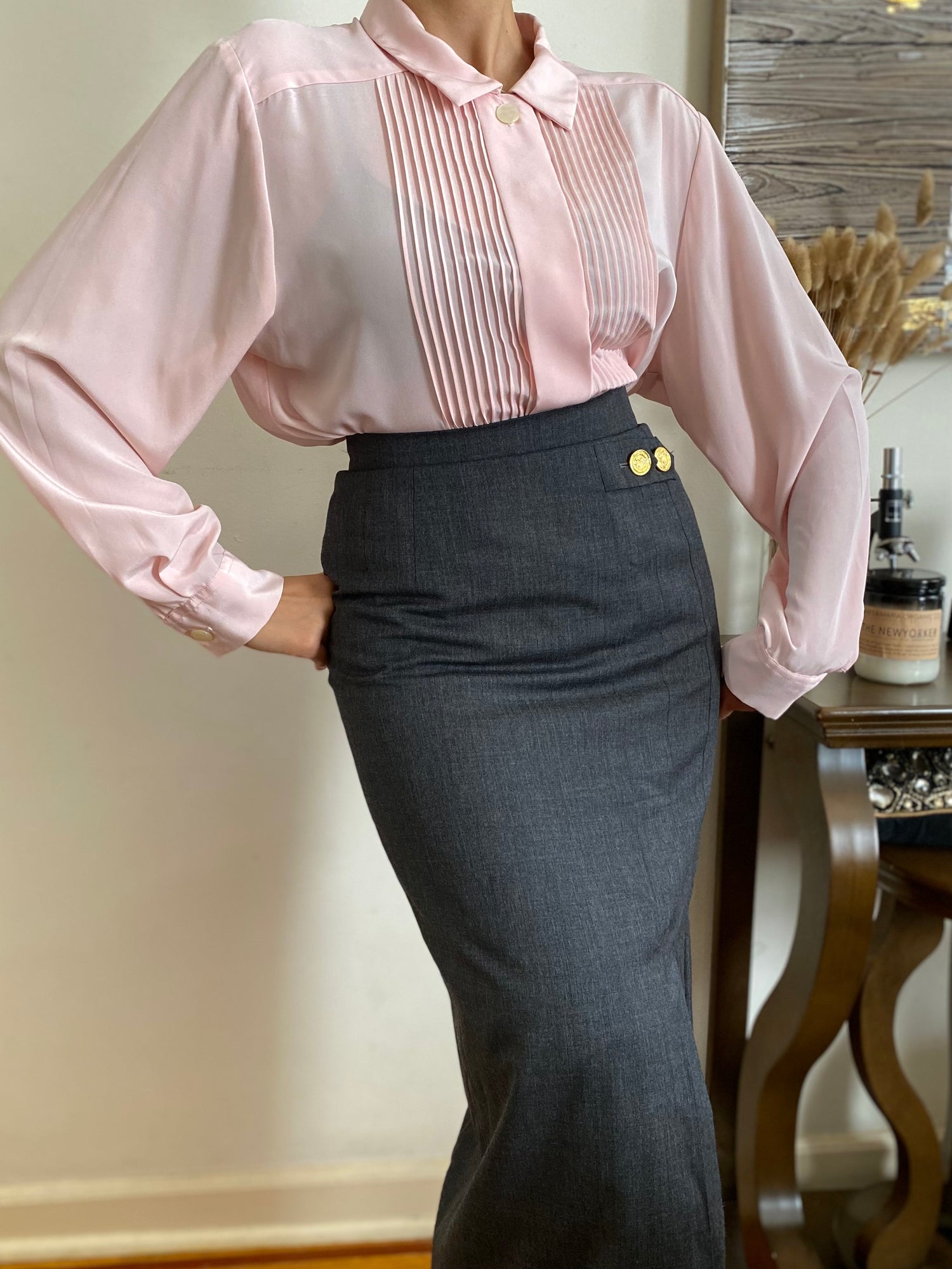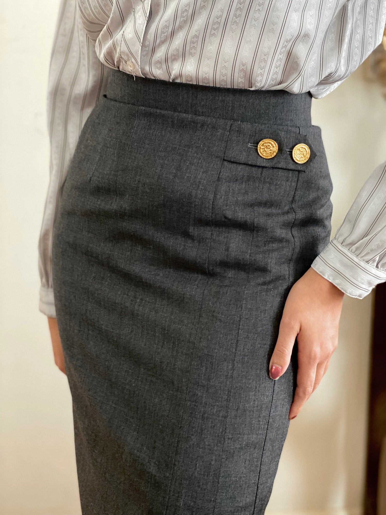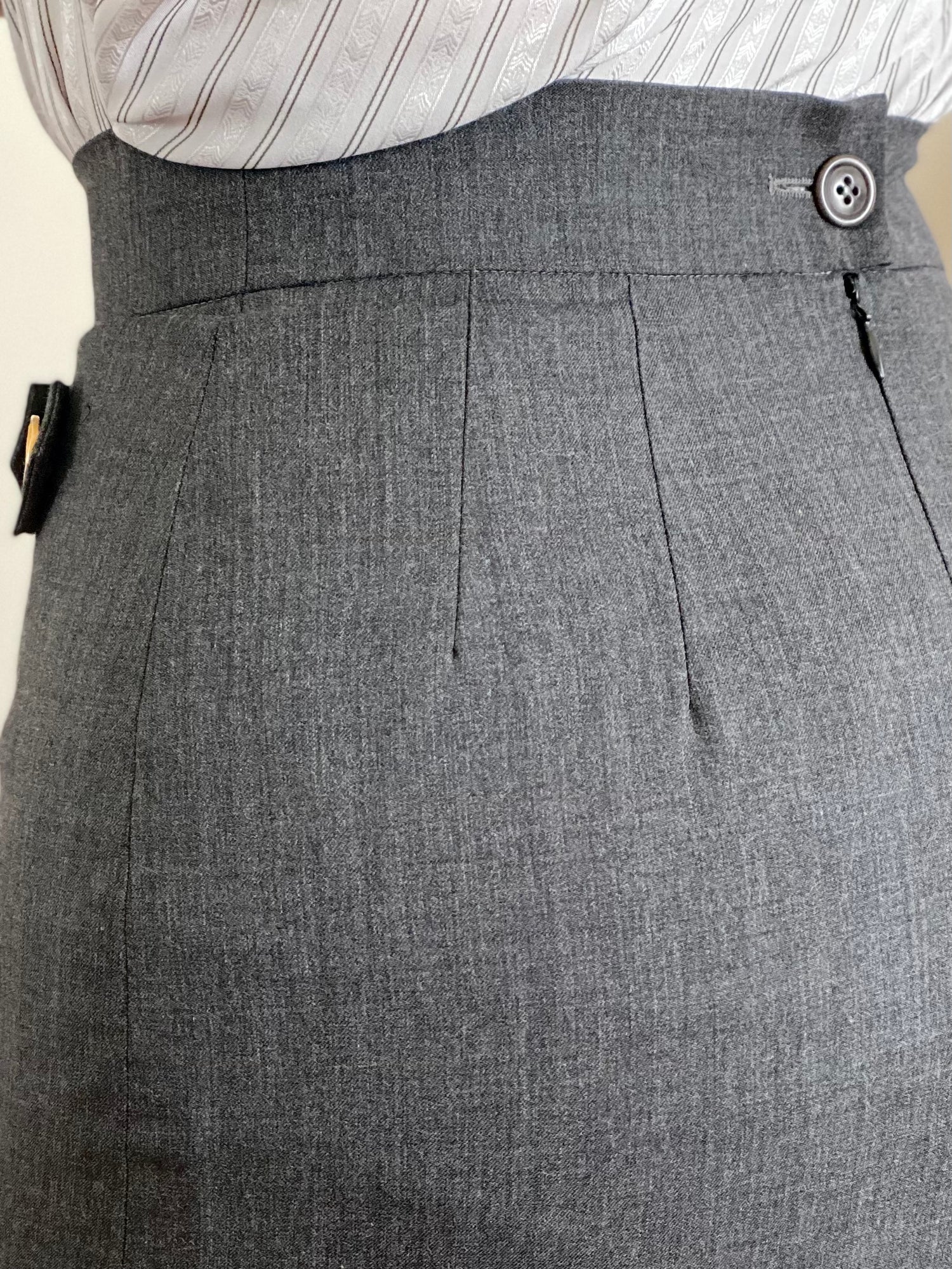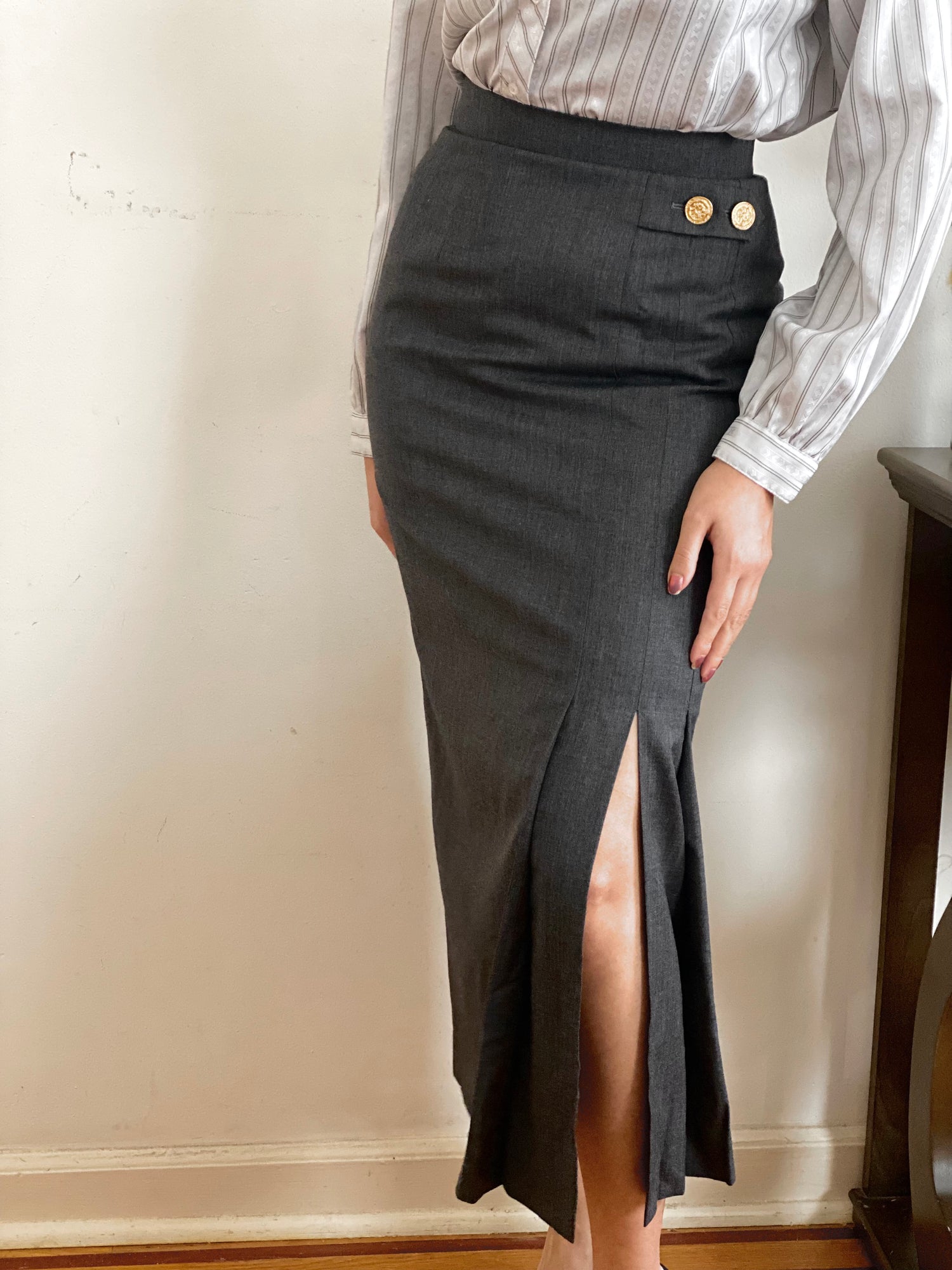 - Features: Decorative gold buttons, Side bottom slit, back closure with button & zipper. There is no stretch to it.