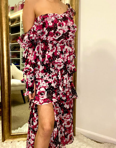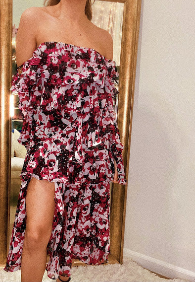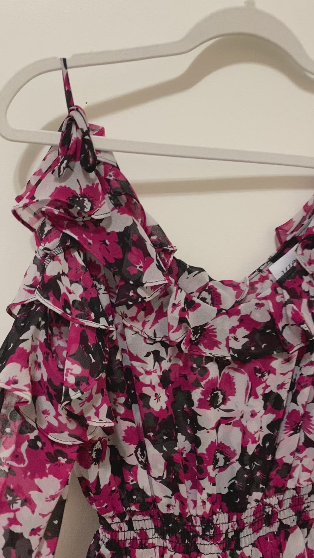Features: elasticized waist band, can be used off-the shoulder, partially lined, ruffle trim.