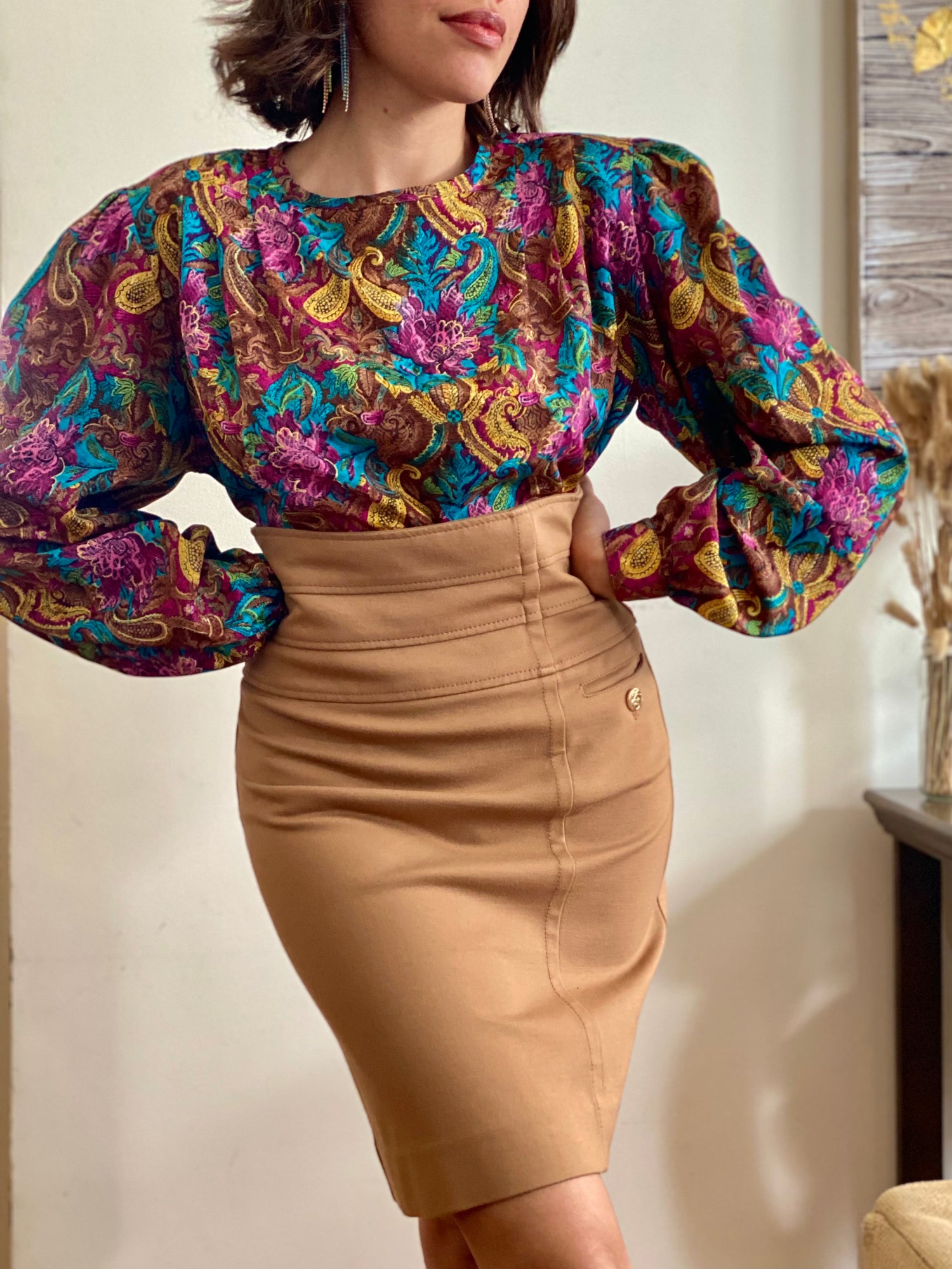 - Features: Shoulder pads, abstract design, puffy long sleeves, round necl.