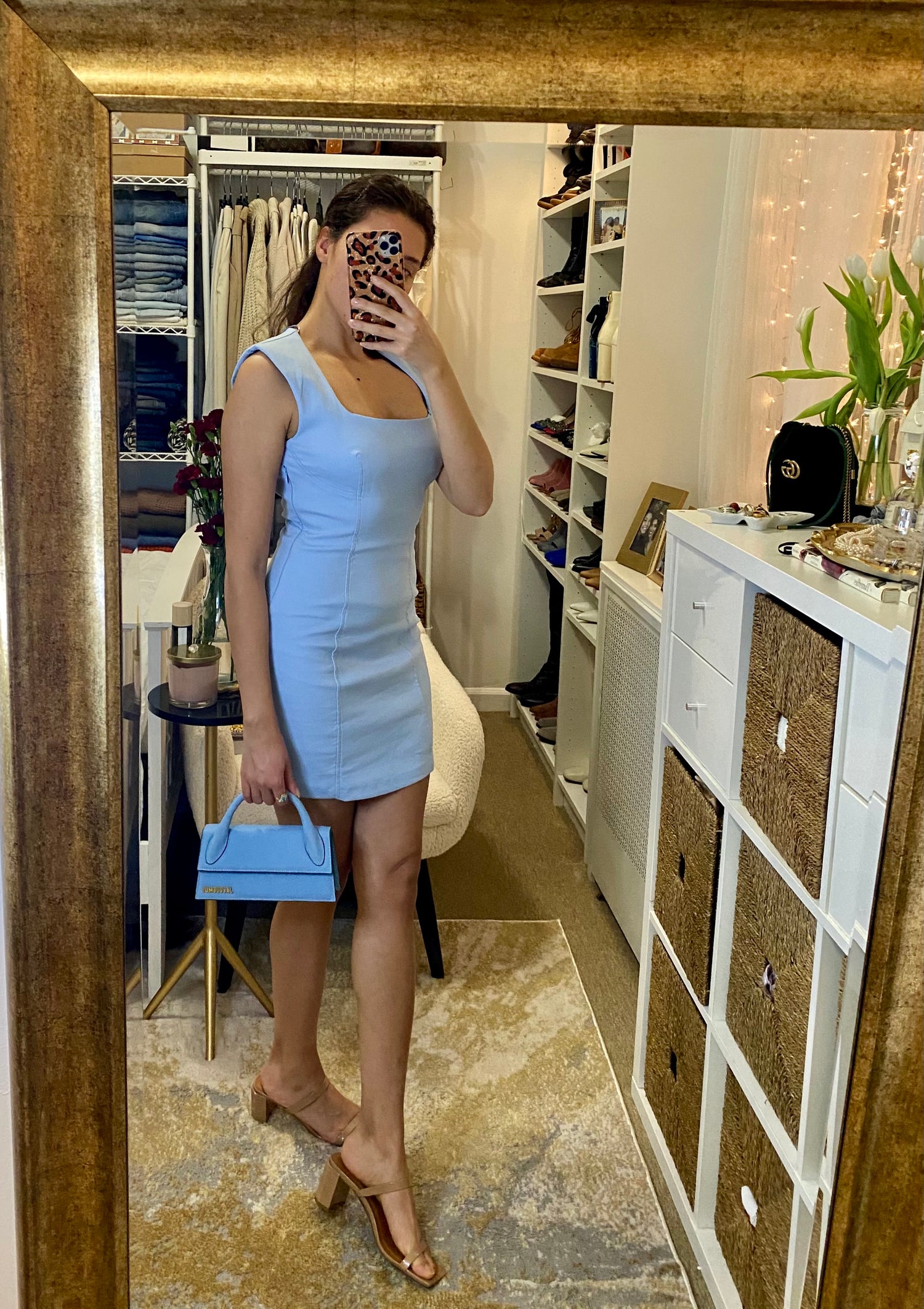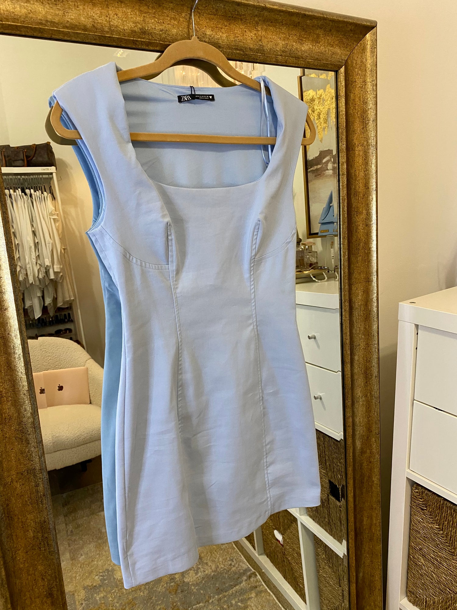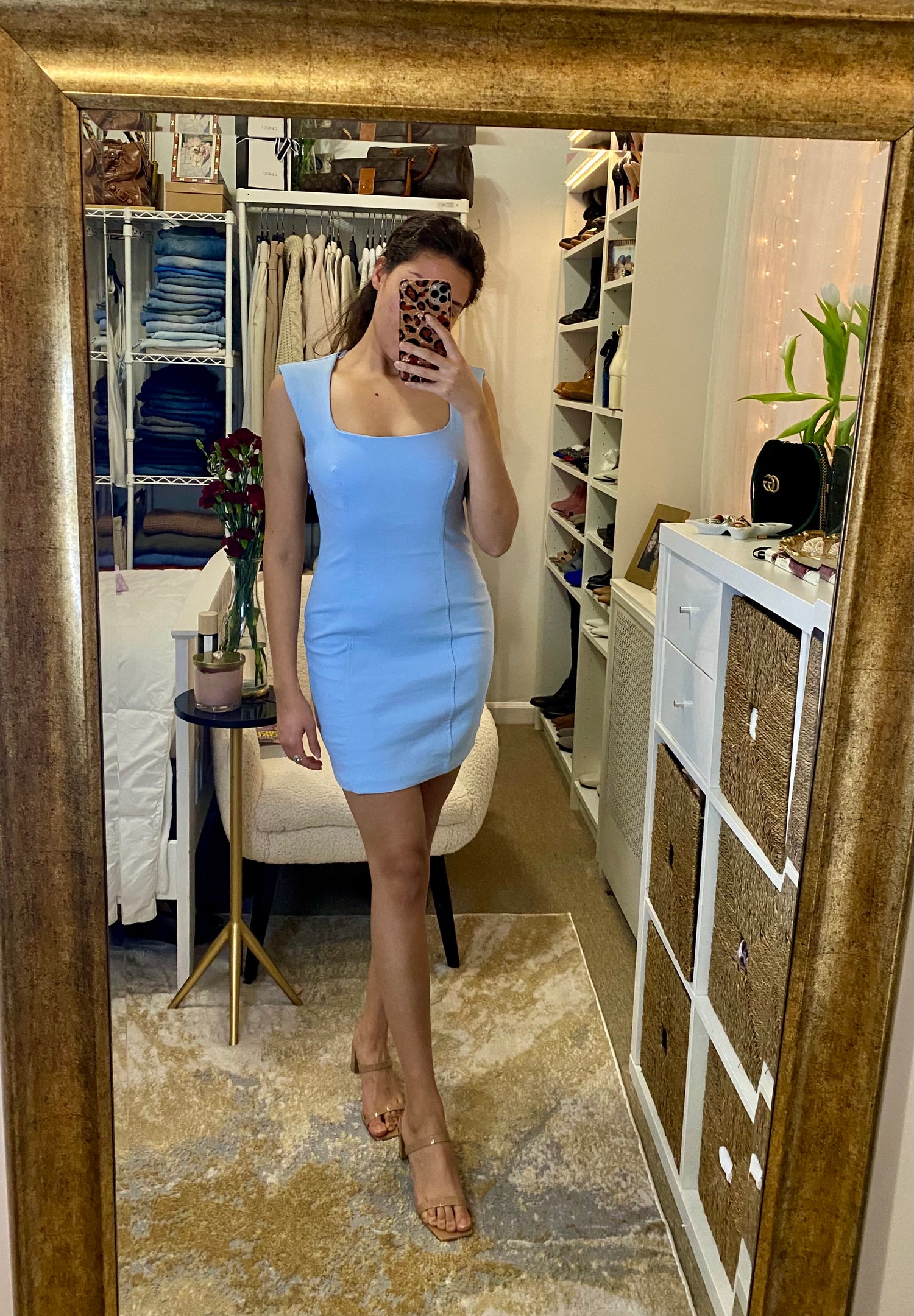 70s style fitted mod mini dress. Features a square neckline, hidden side zipper closure and interior lining.