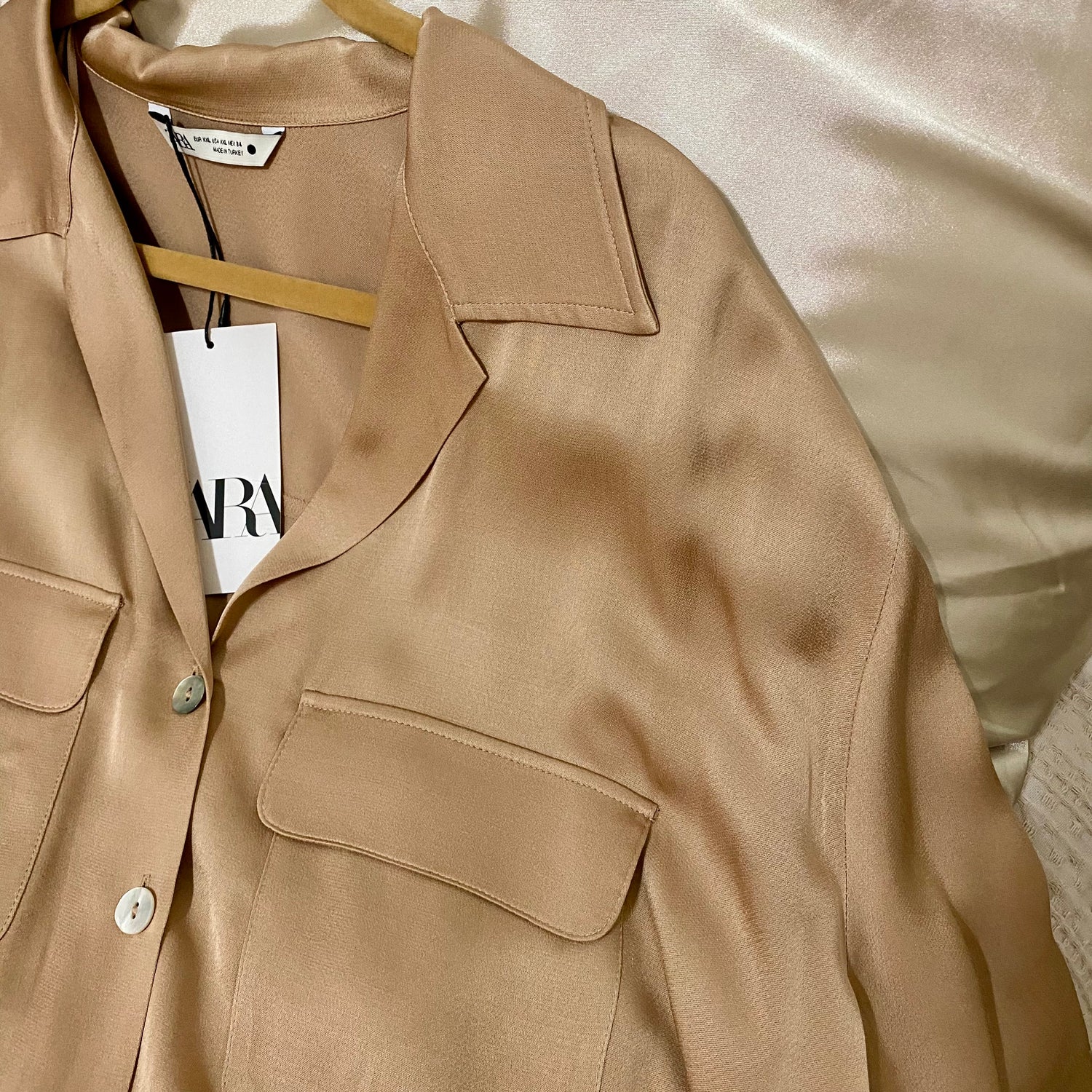 Flowy, satin-like blouse with short sleeves, front patch pockets. Light weight and easy to style.