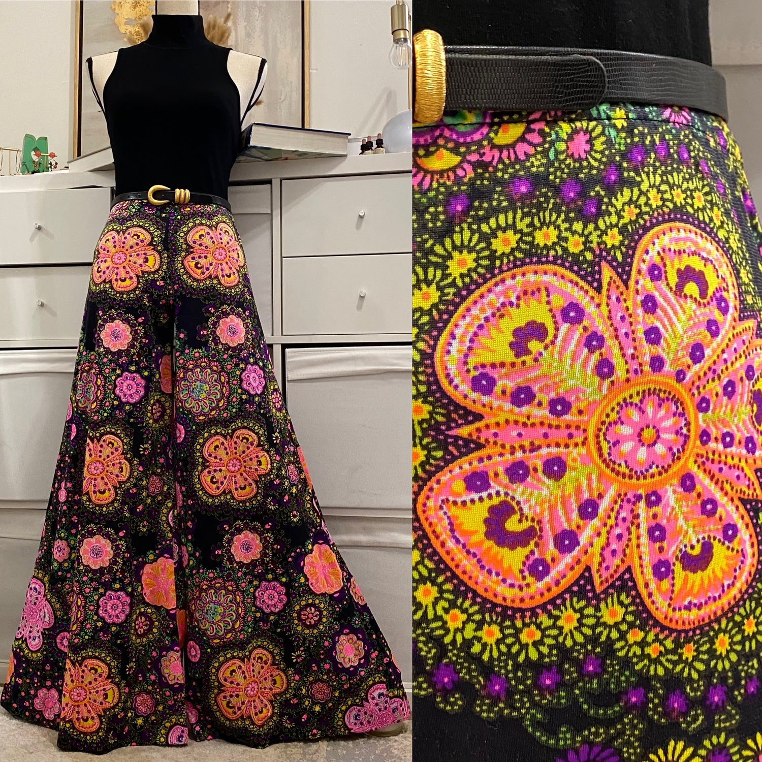 60s-70s Groovy , Psychedelic Low - Midrise Palazzo Pants (XS-M)
