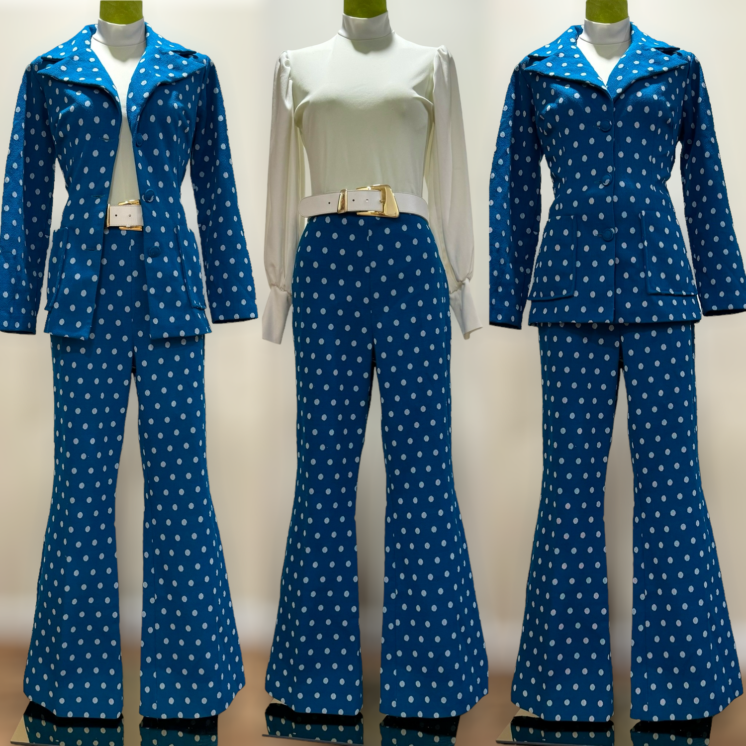 70s Blue, Polka Dot Wide Leg 2Pc Pantsuit (M, 29"-33" Waist)