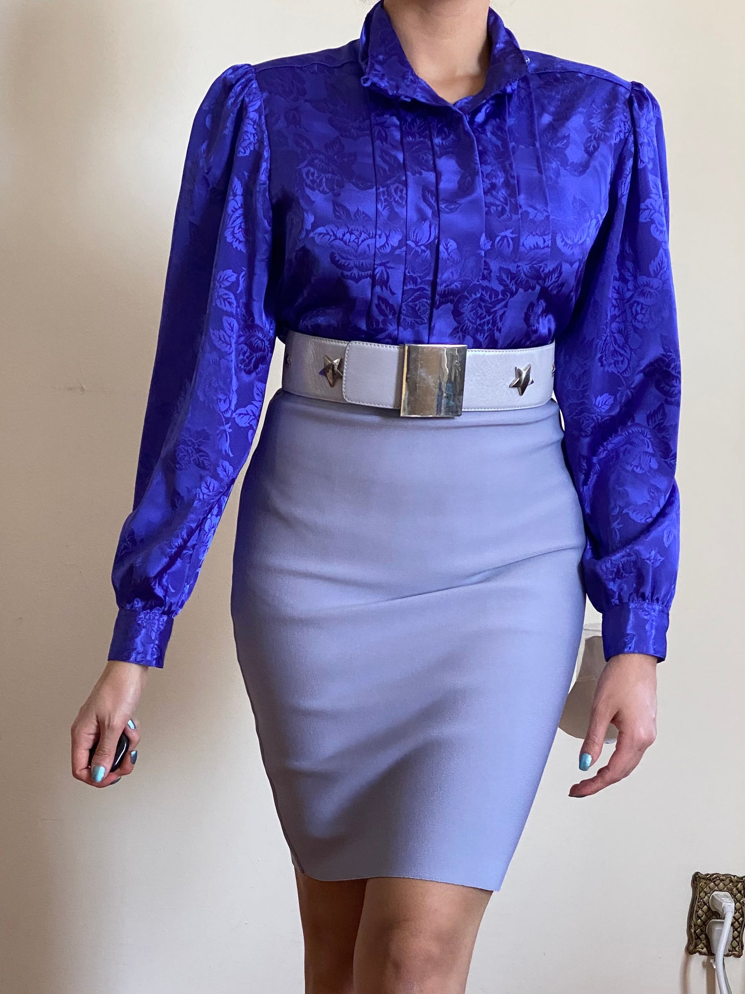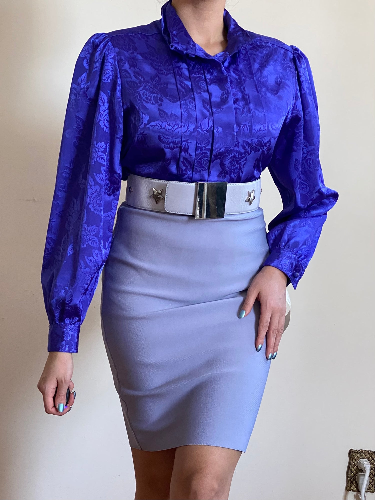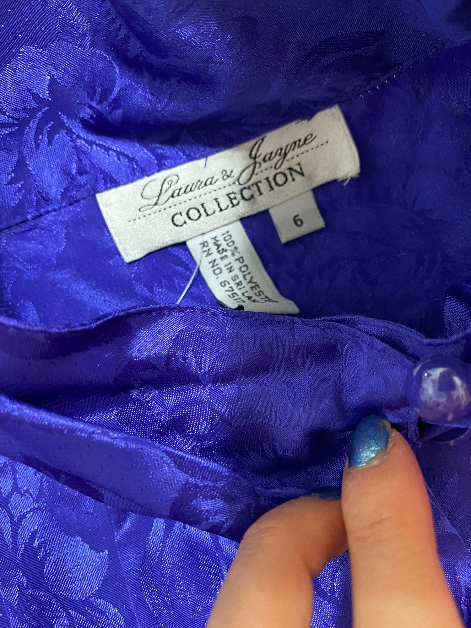 - Features: Button up, long sleeves, button cuff, high mock neck. Has a floral pattern & fabric has sheen to it.
