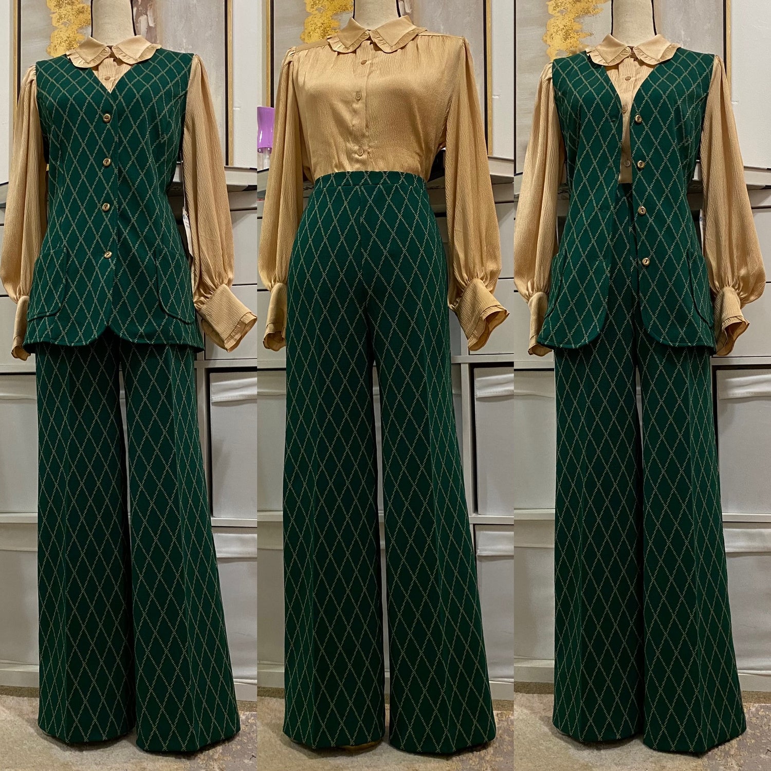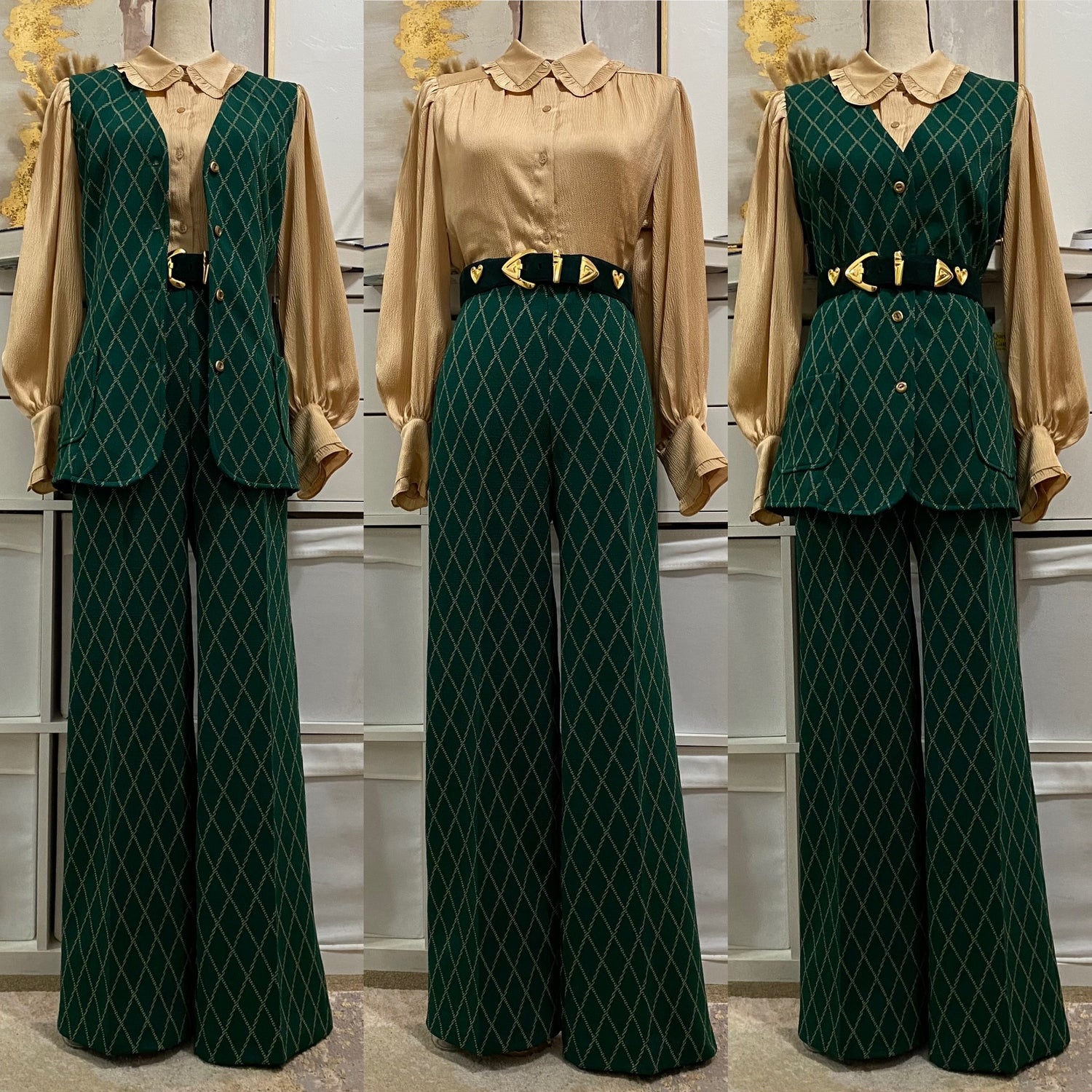 Classic 1970's vest suit from Queen Casuals. Comes in a gorgeous green diamond pattern of green and gold. It brings a sleeveless vest with two functional side pockets. The pants feature a highrise, comfortable elastic waistband and slight flare. Comfortable and easy to style.