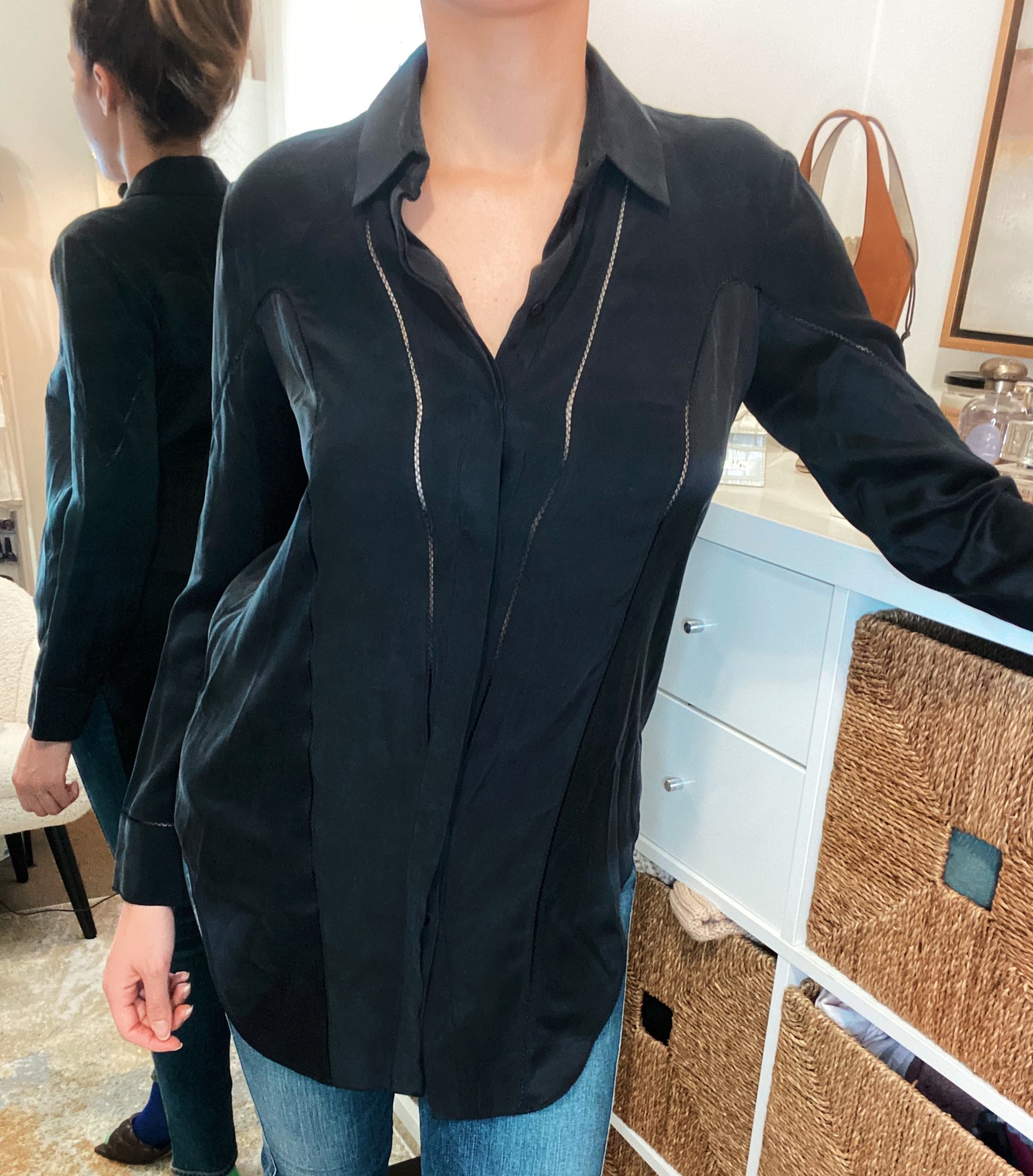 Features: Long sleeve with collar, tunic style, button closure at top front