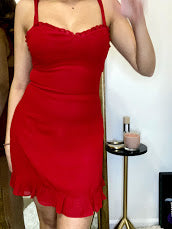 Features: Tie shoulder straps, hidden zipper and smocked elastic at the back, ruffled neckline and hem, lined. Length: 30.75" from shoulder.