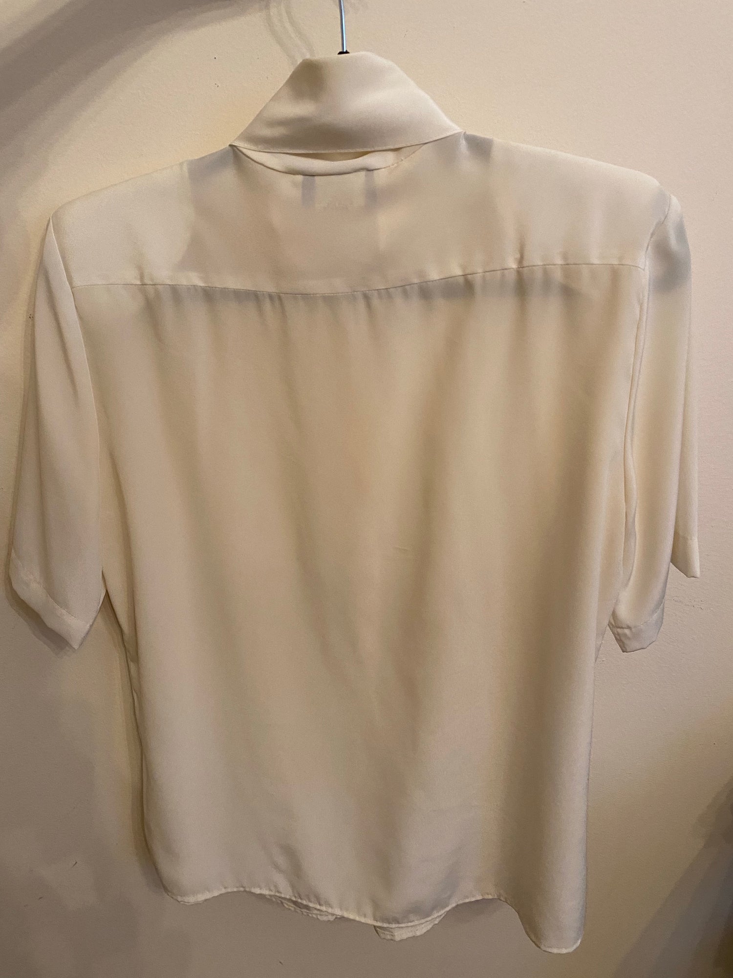 - Features: Made in the USA, top decorative button, somewhat sheer, short sleeve