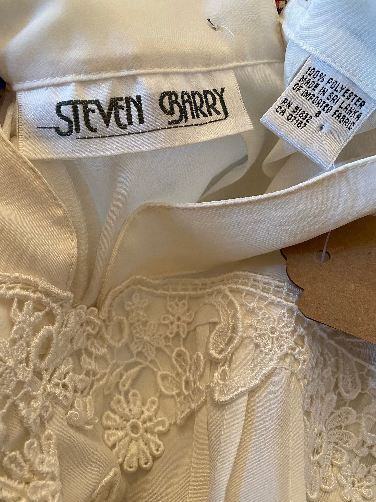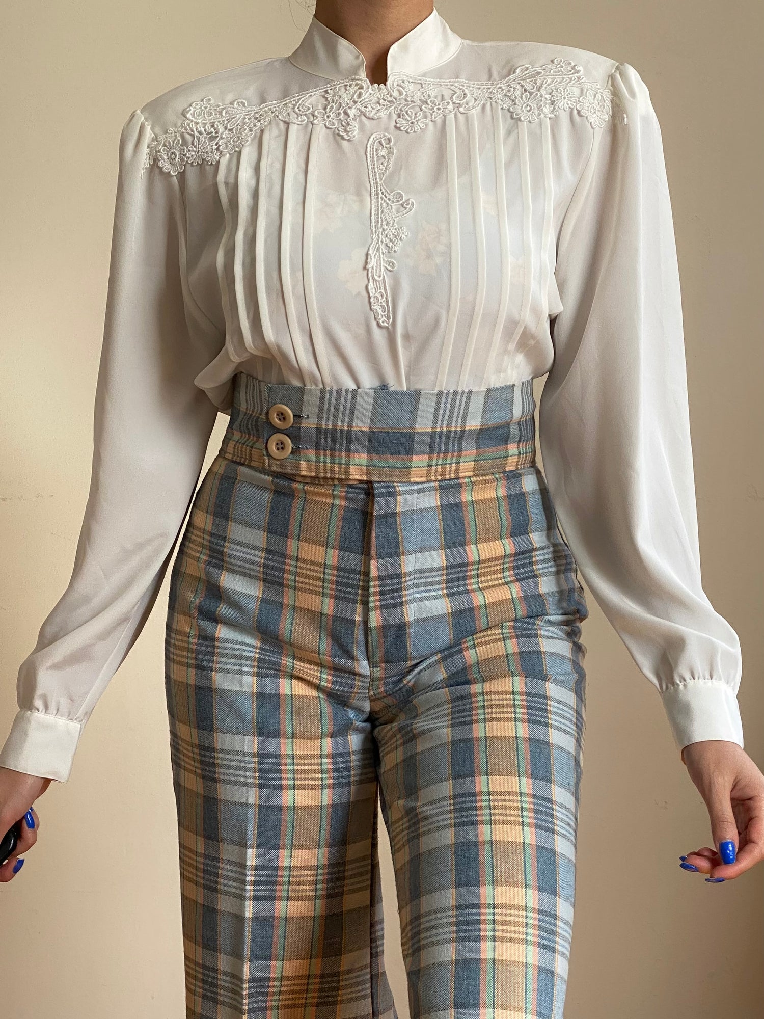 80'S White Pleated Lace Mandarin Collar Blouse (S-M)