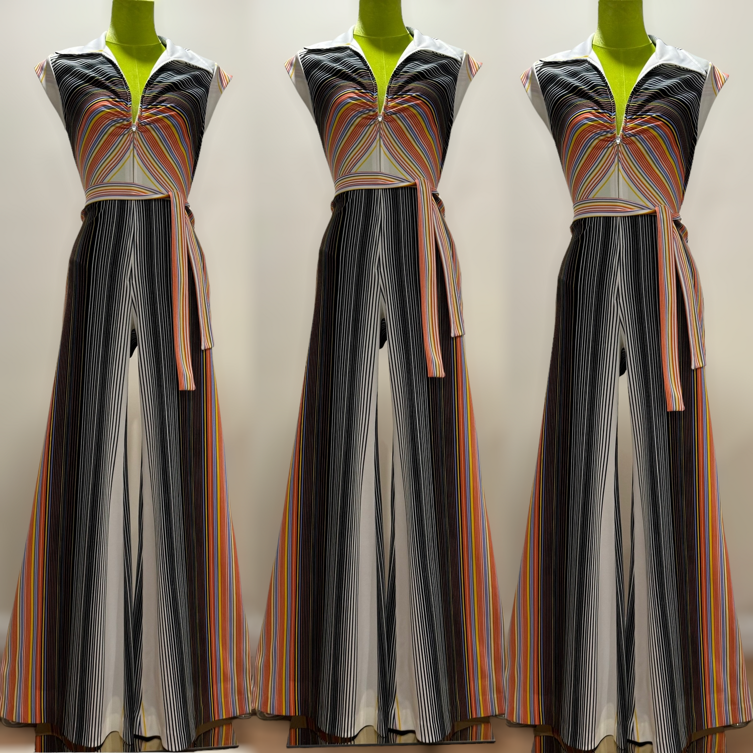 Rare 70s fun, striped, multicolor jumpsuit. Features a zipper front, pointy collar, bell bottom flares, and a matching waist tie. Please note this is better for someone with a short torso.