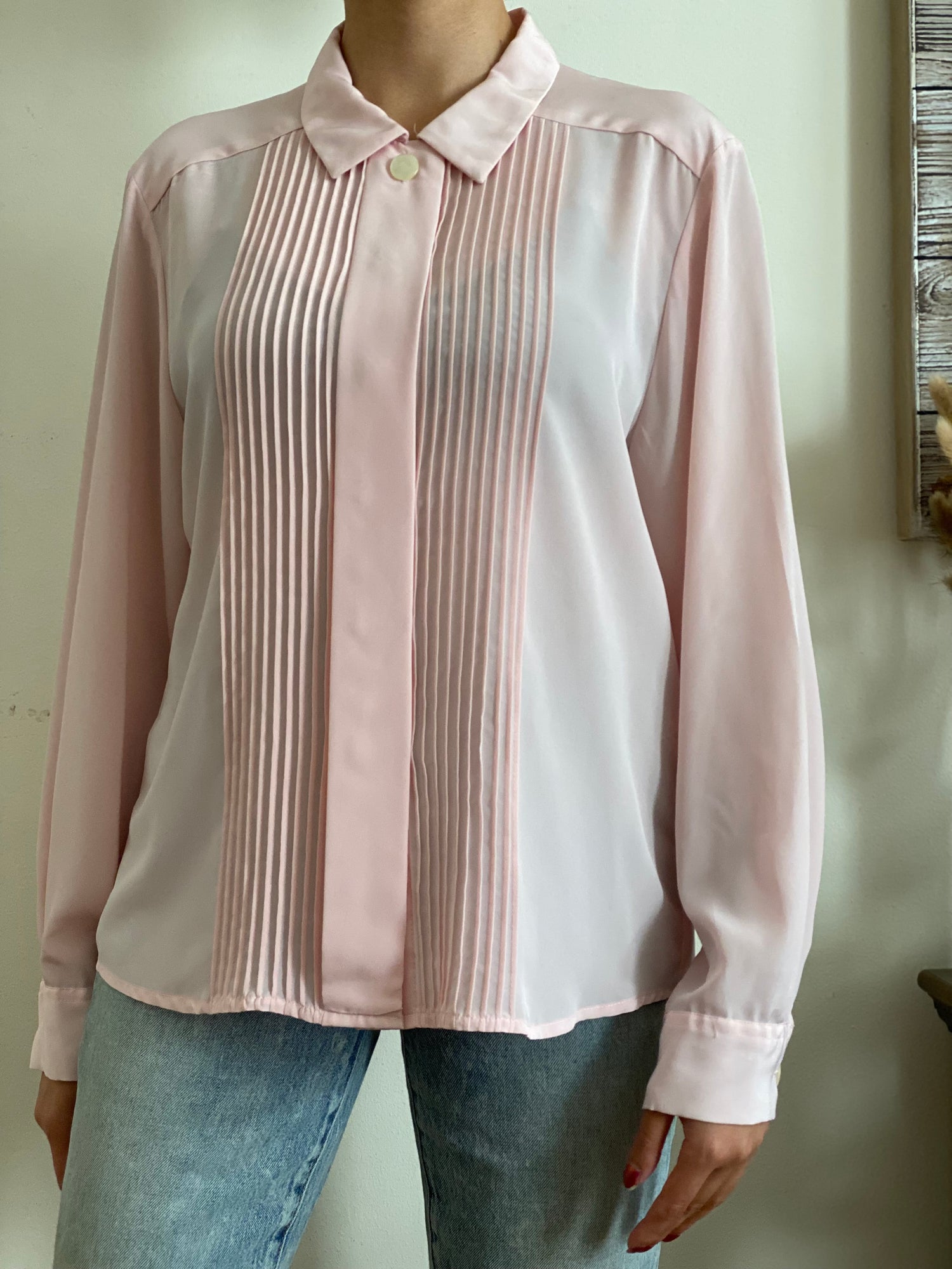 - Features: Button down, single decorative top center button, long sleeve, front pleat design, notch collar.