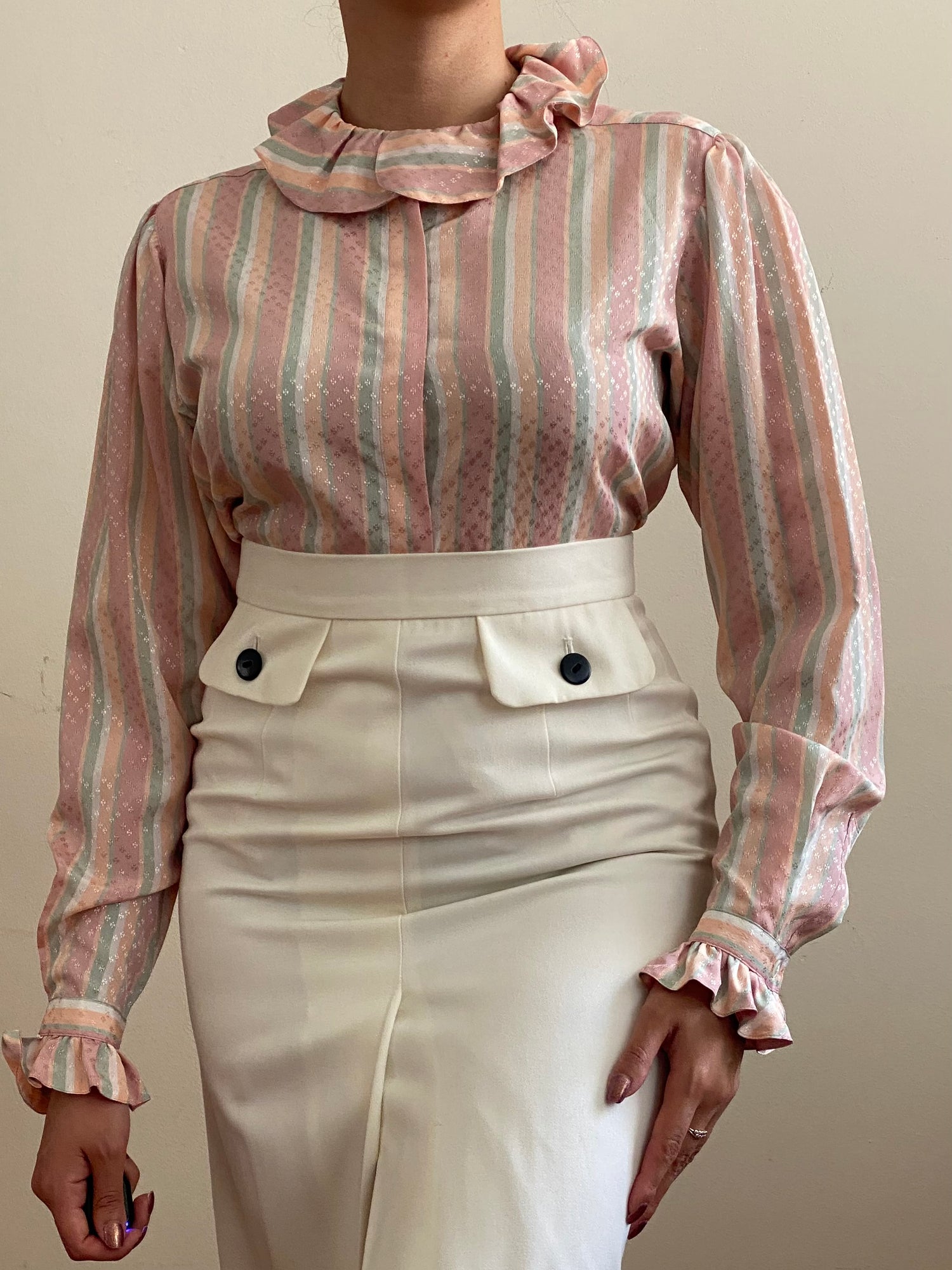 70s 80s Ruffle Collar Button Up Blouse w/ sheen (S-M)