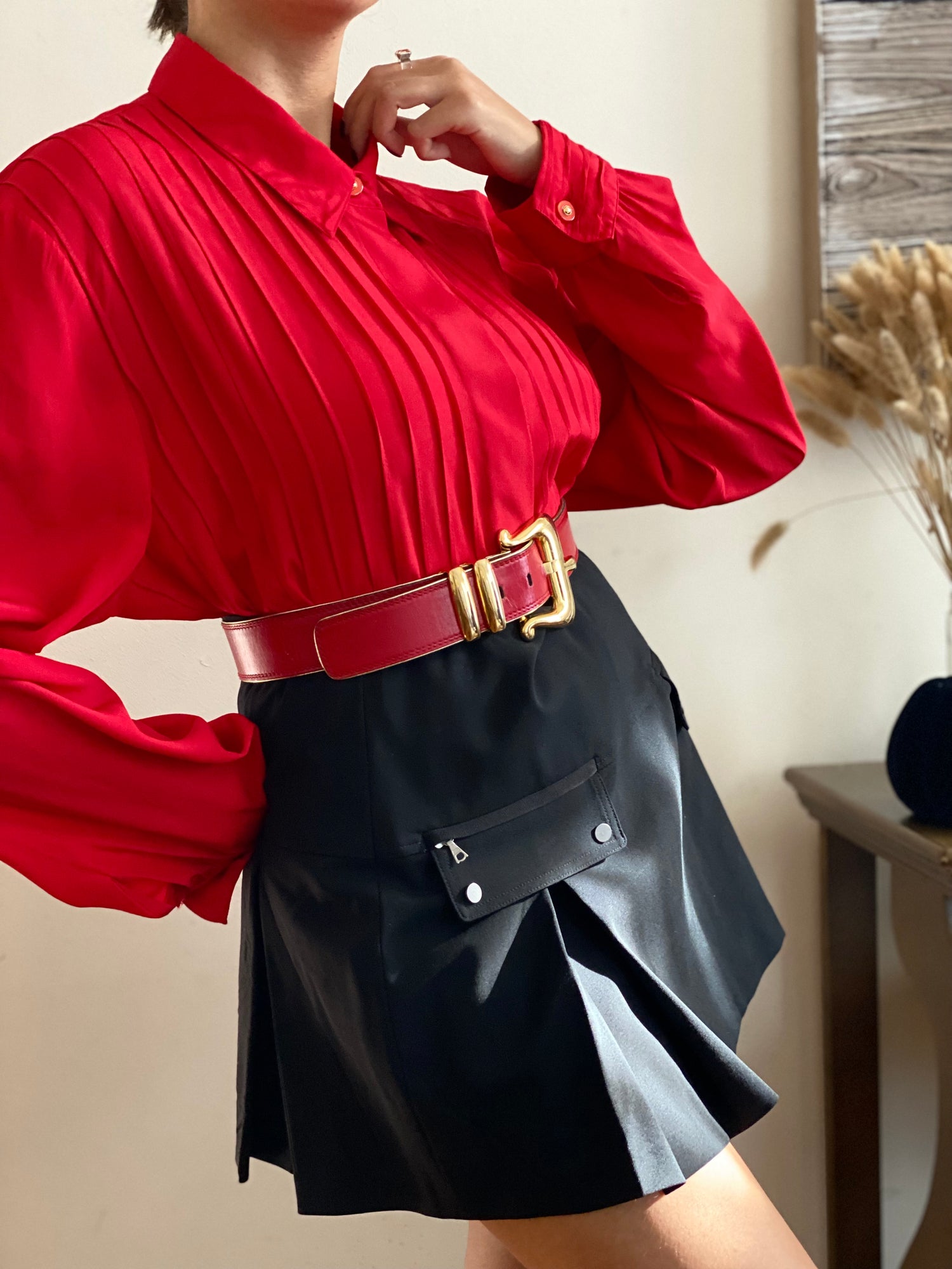 - Features: Button down, button cuffs, long sleeves, pleated detailing in the front, front single decorative button with gold center.