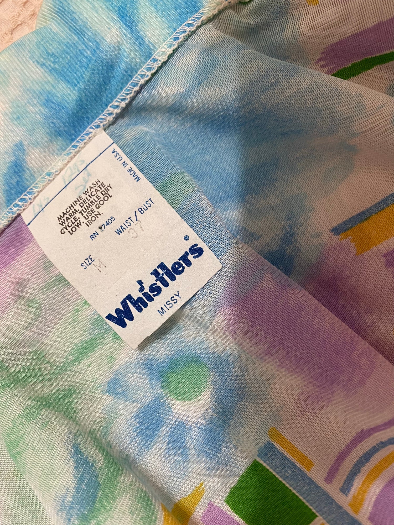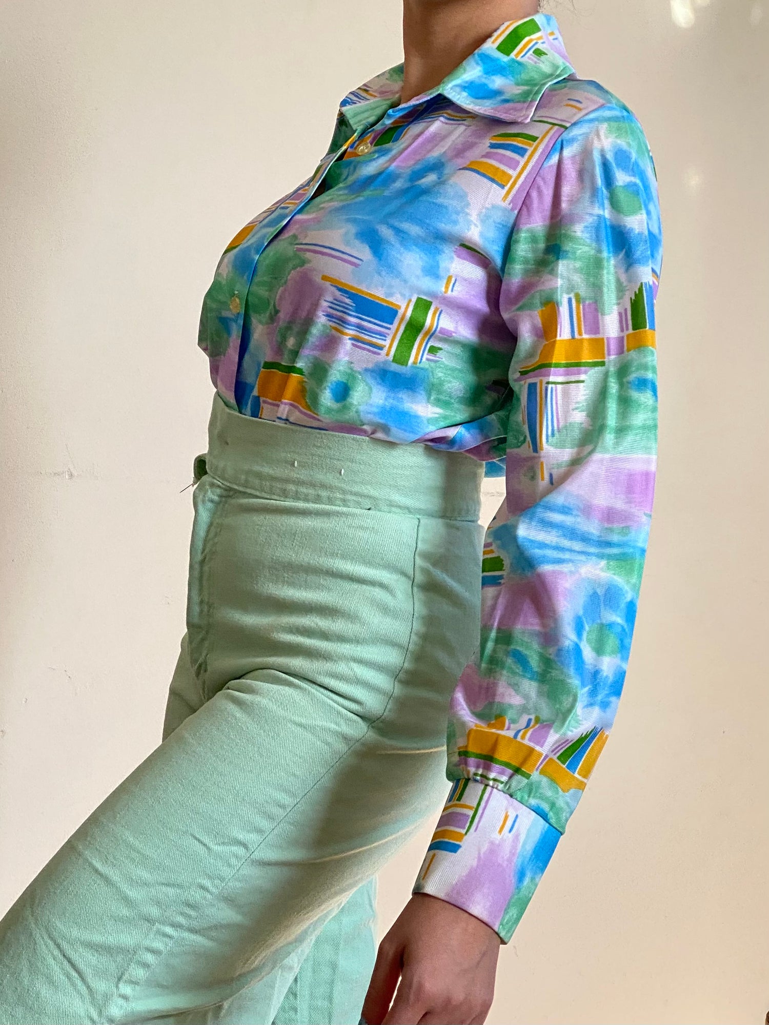 70's WATERCOLOR ABSTRACT STATEMENT COLLAR BLOUSE (M)