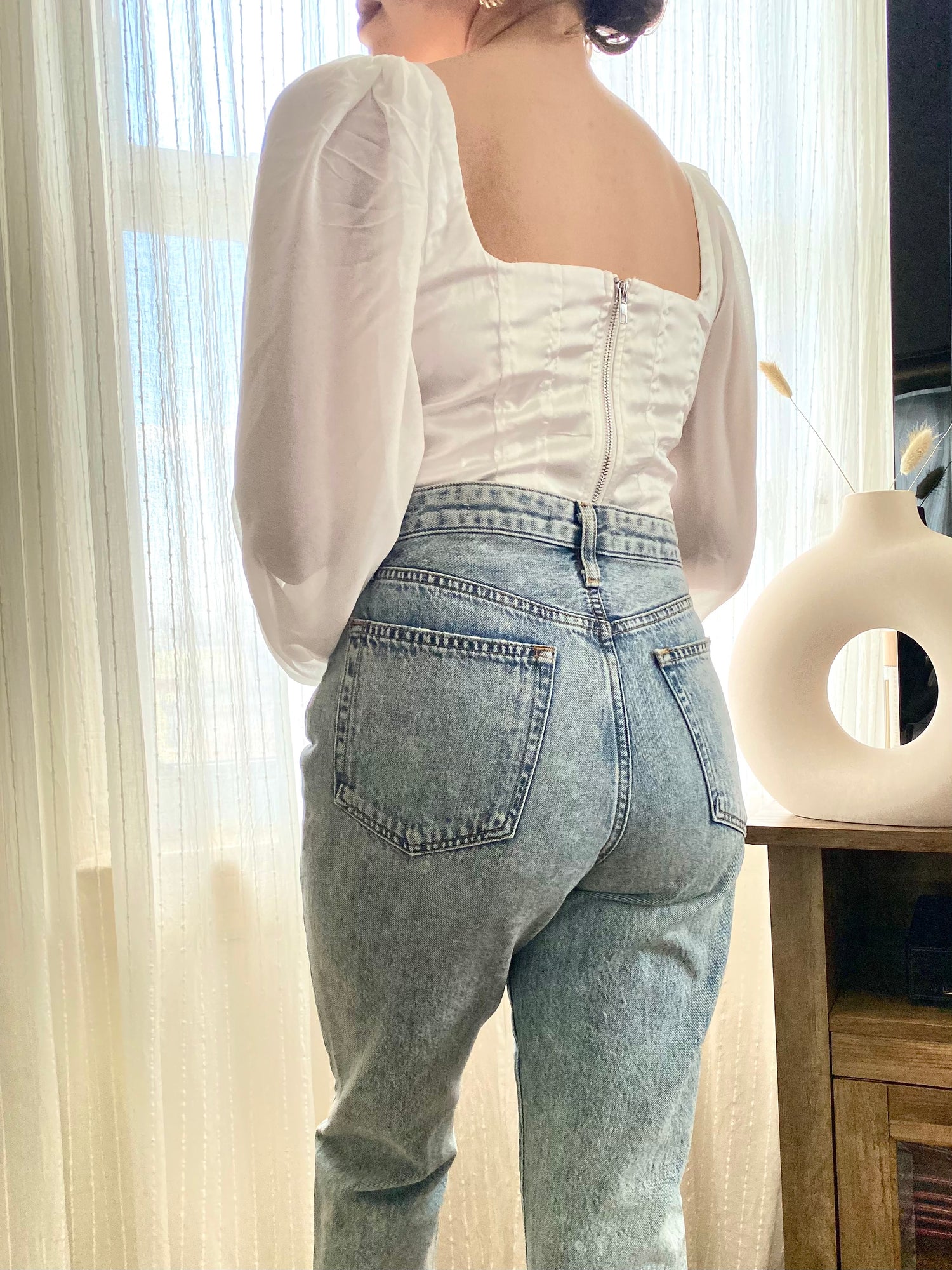 - Features: s atin corset top with structured front, balloon sleeves, elastic cuffs and exposed zip at the back.
