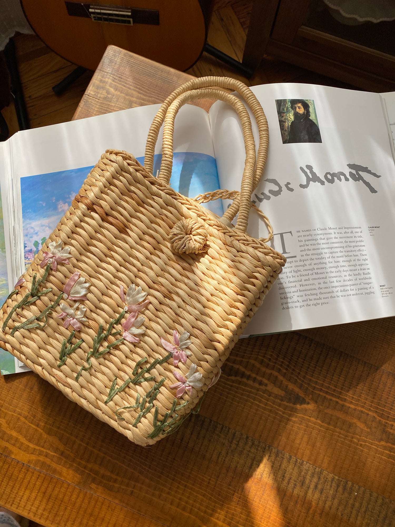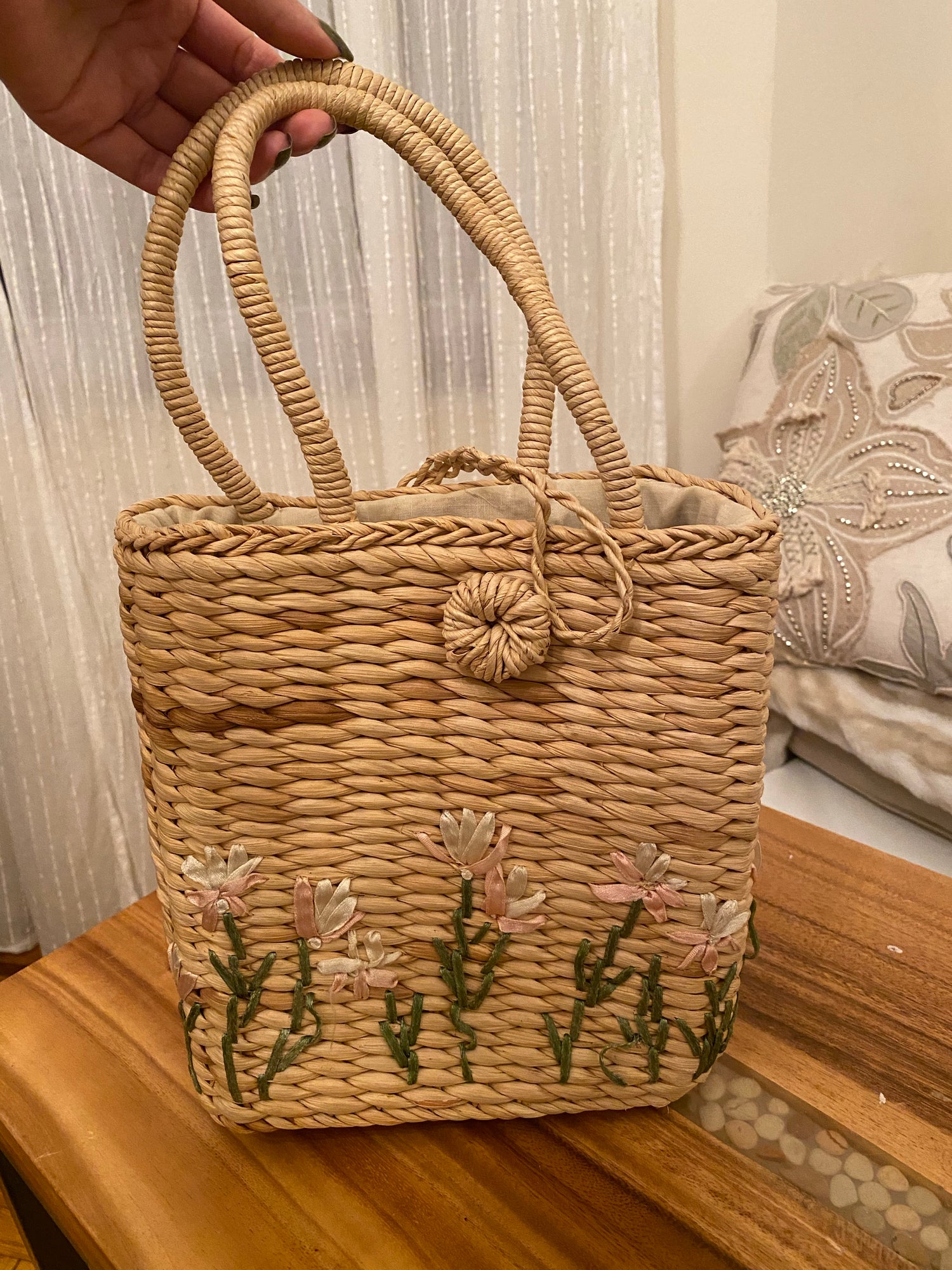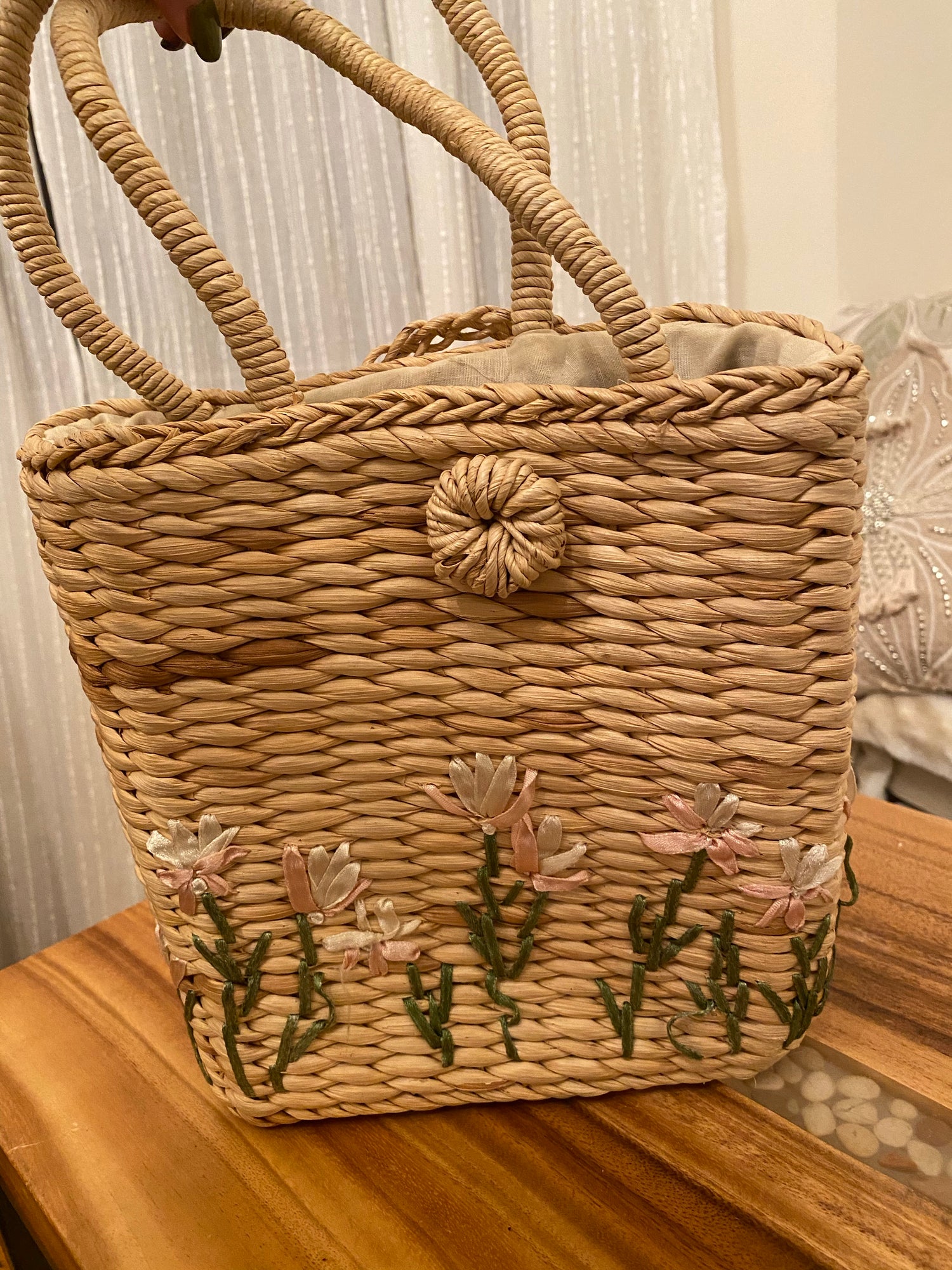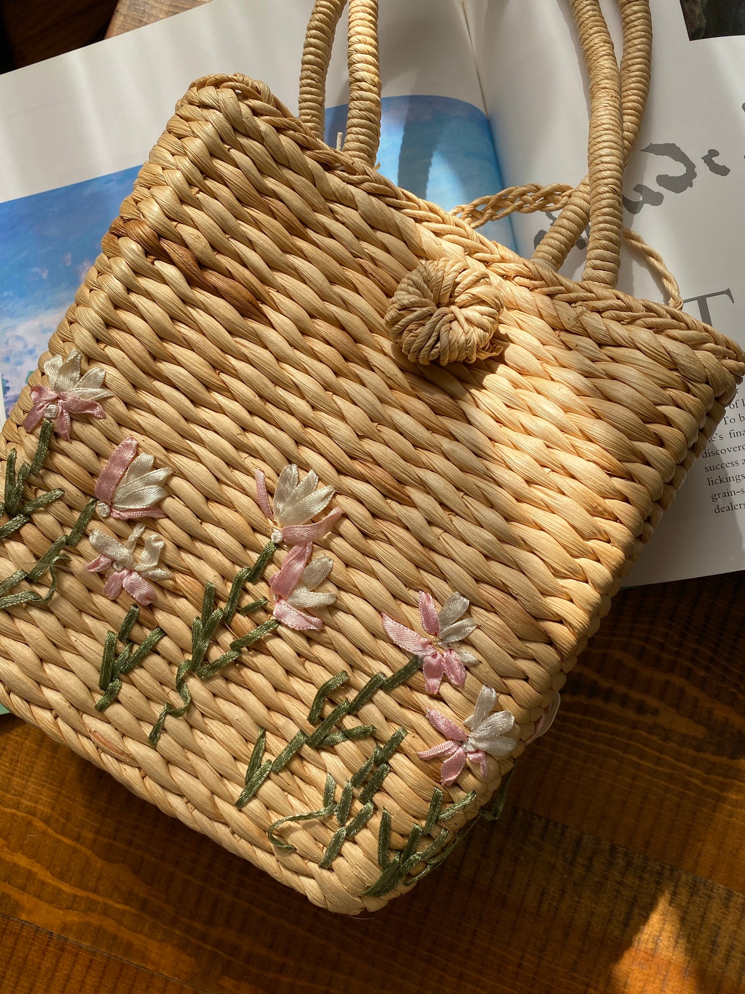 Woven Straw Basket Embroidered Handbag with flower design.