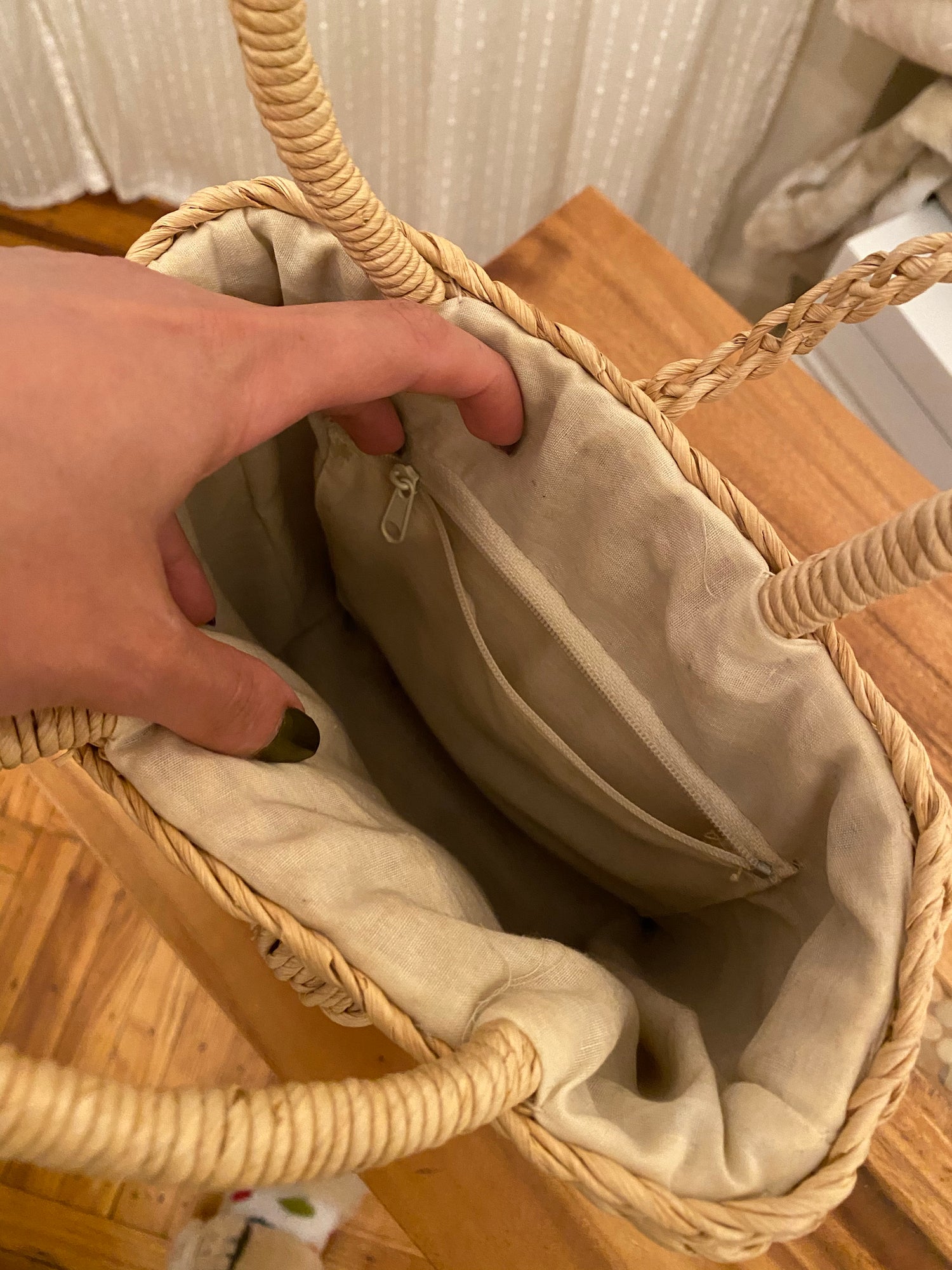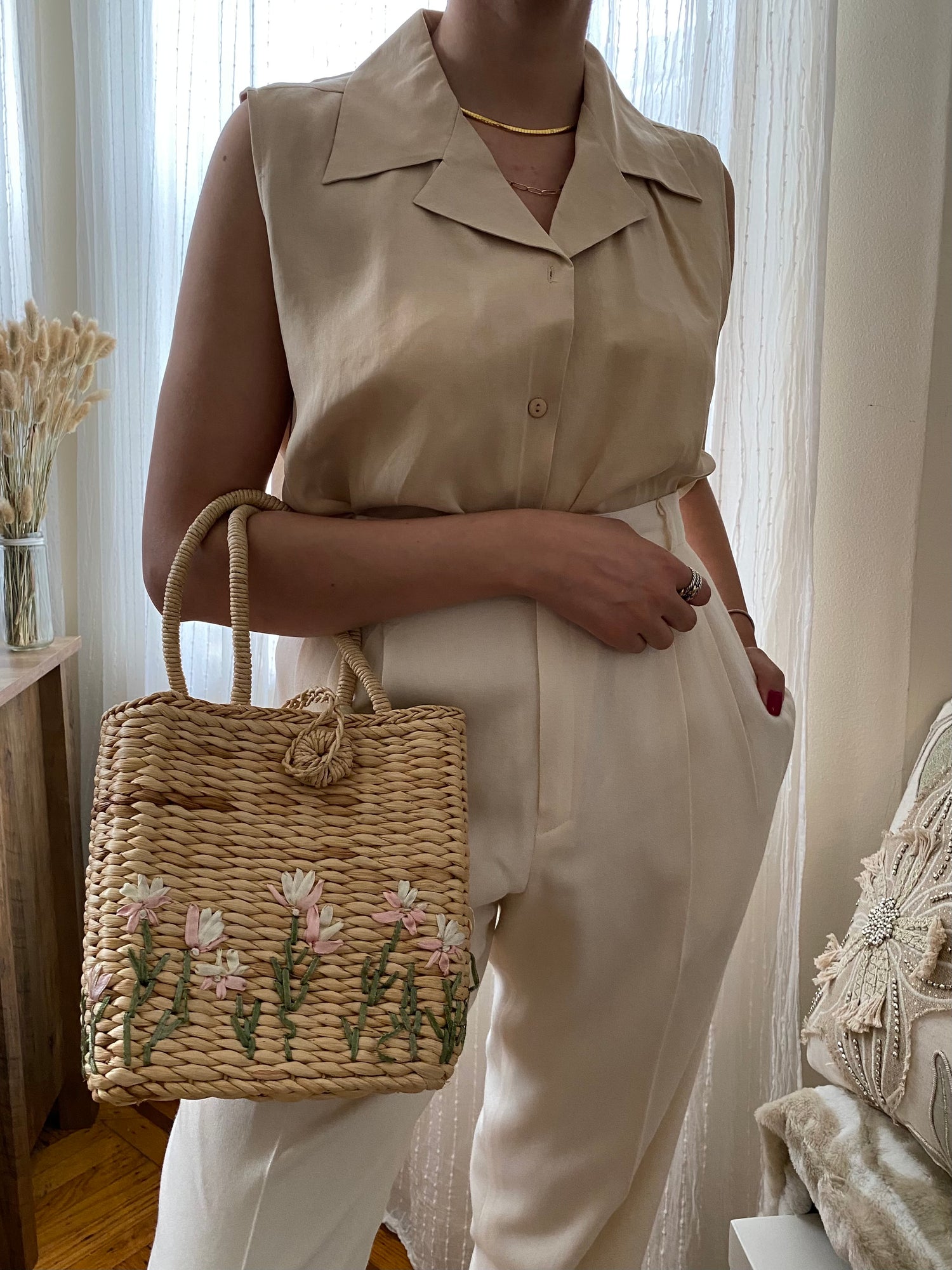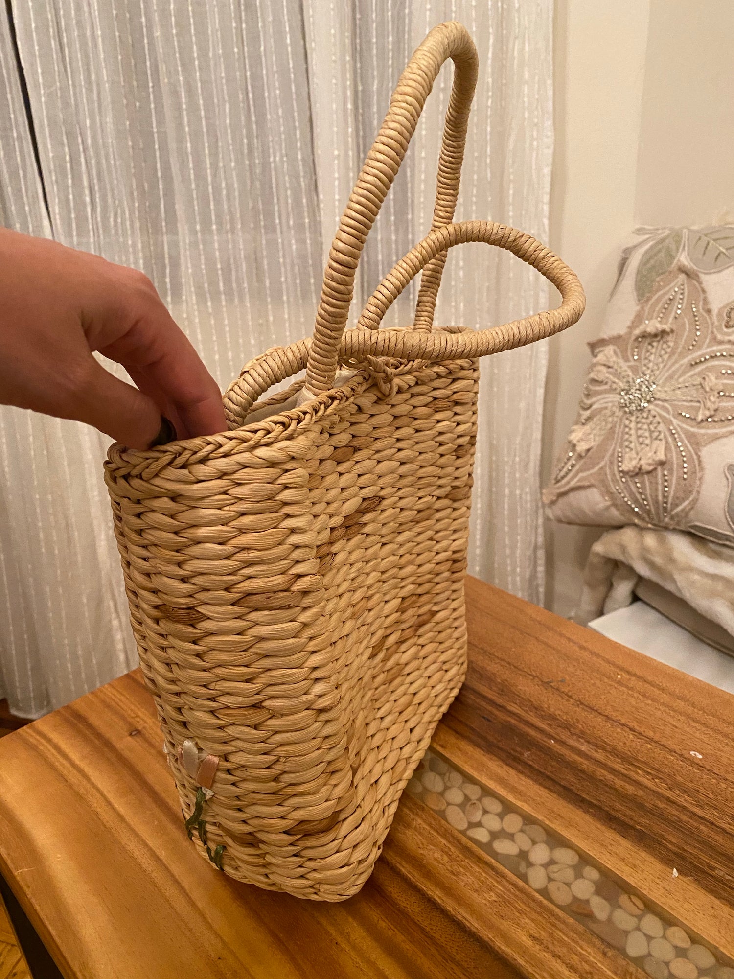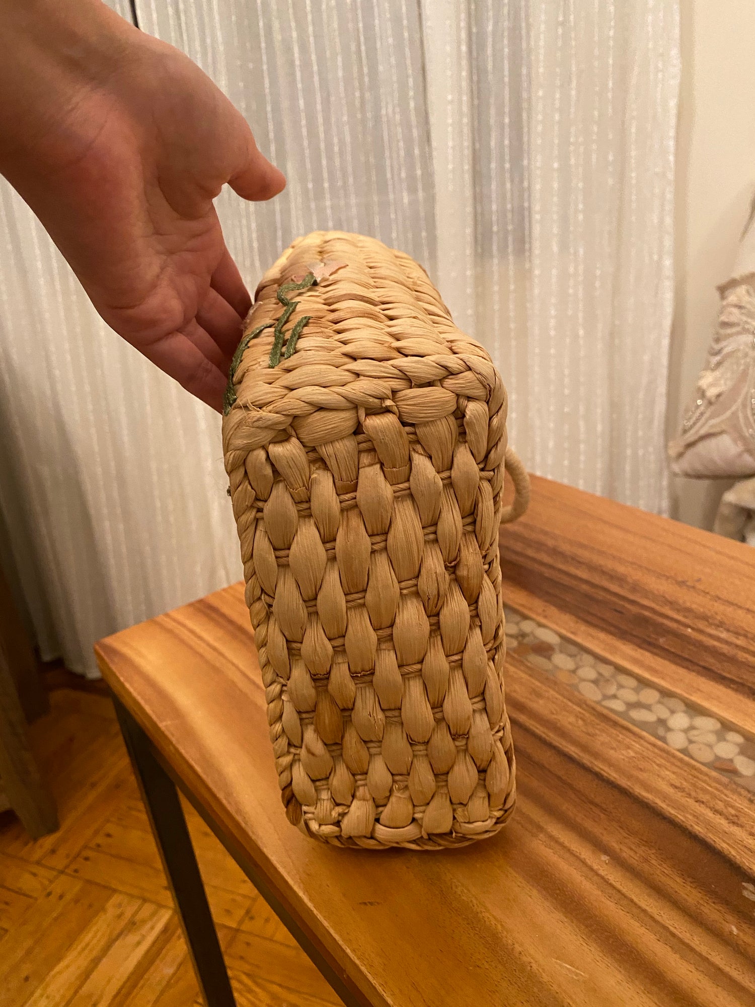 Woven Straw Basket Embroidered Handbag with flower design.